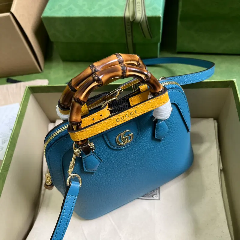 This Gbag Diana Bamboo Mini Tote Bag, complete with original green box packaging, features two recognizable brand elements: bamboo handles and Double G hardware. The sky blue leather and two handle straps complement each other, creating a dynamic and elegant look. The bag features sky blue leather with shiny antique gold hardware. As shown in the picture, this bag comes with two decorative handles with Double G detailing, bamboo handles (4.5 cm drop), and a detachable and adjustable shoulder strap (55 cm drop). Model No. 715775. Dimensions: 20 cm (width) x 16 cm (height) x 8.5 cm (depth). Color: Sky Blue/Original Leather.