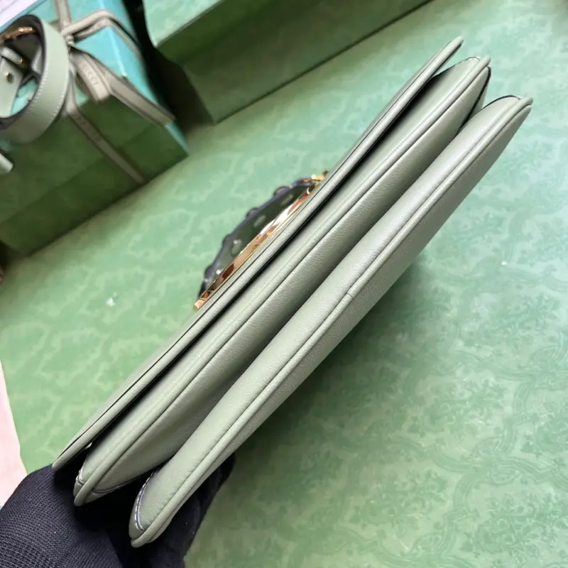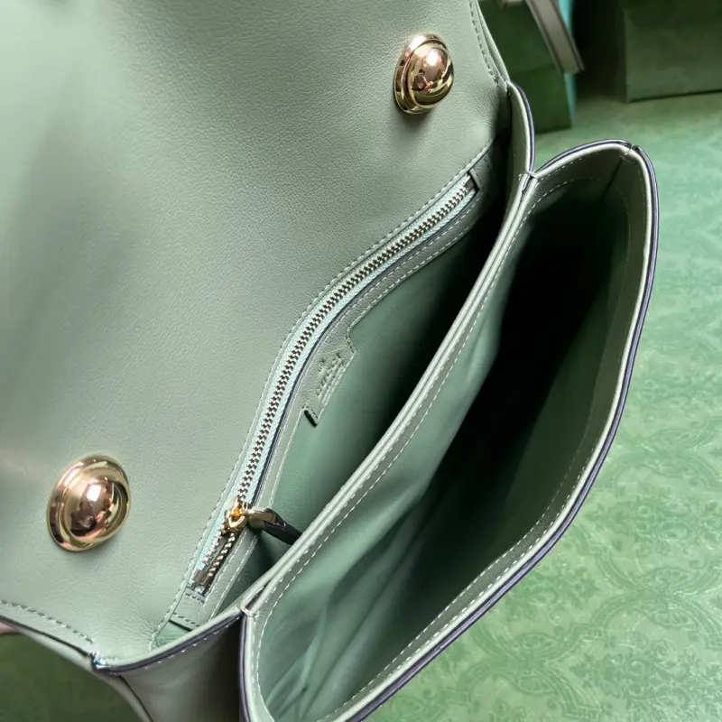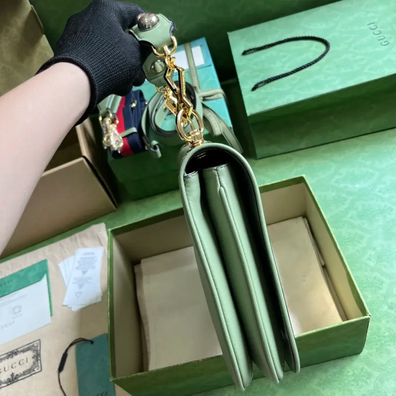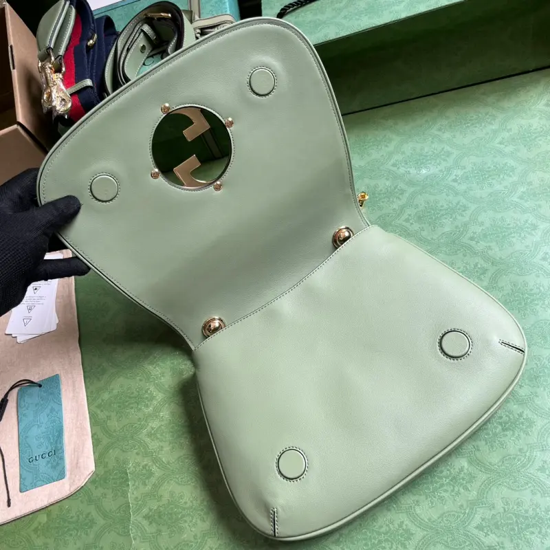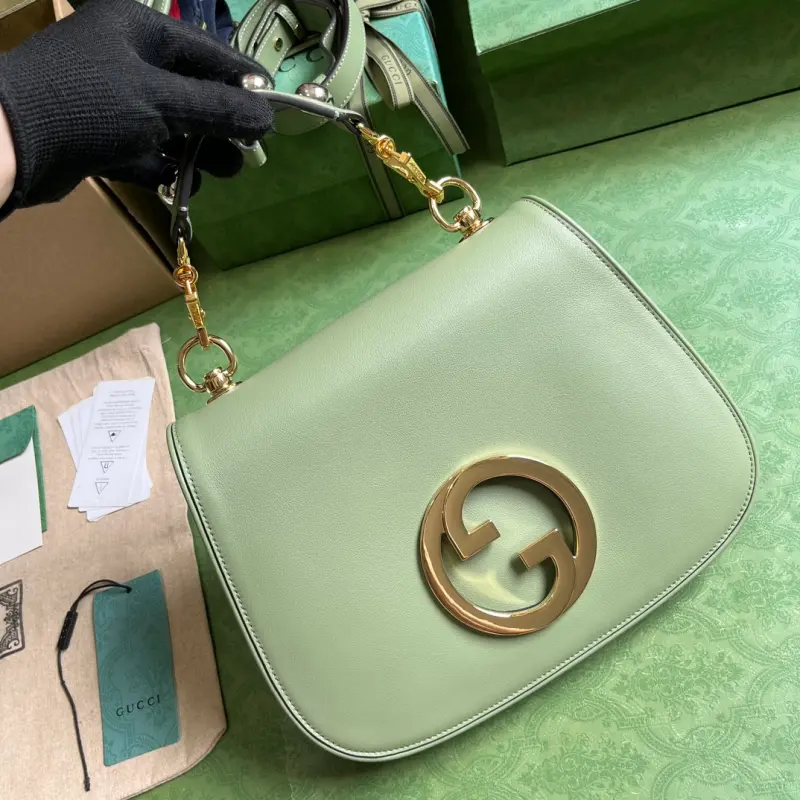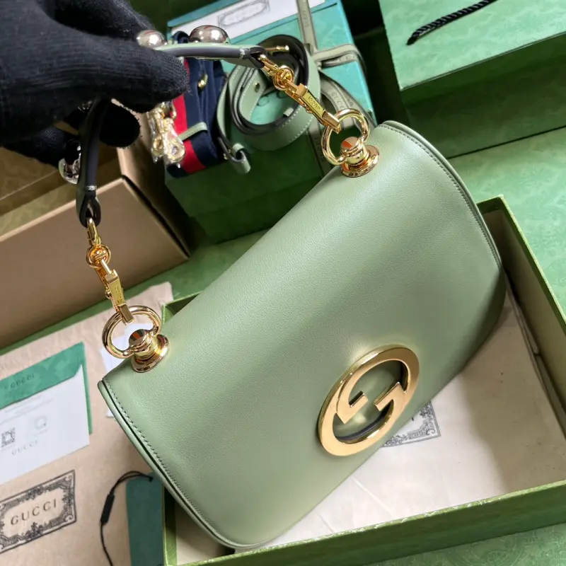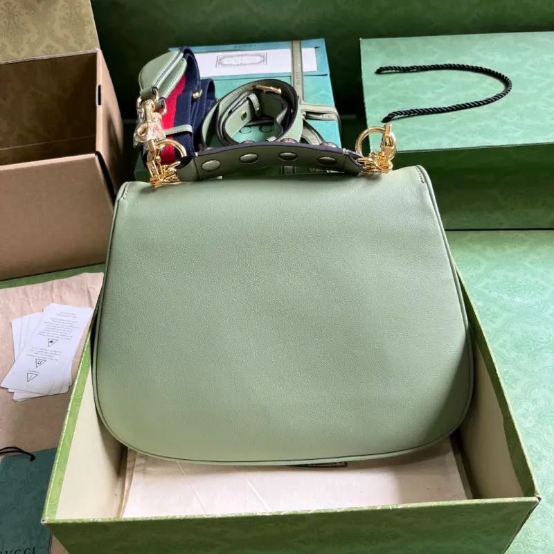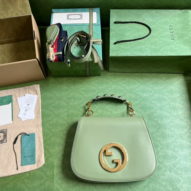 Gbag Blondie small handbag (comes with full original green box packaging). This new collection features a selection of iconic pieces from the house’s archive, reinterpreting the Interlocking G logo. Gold-tone hardware lends this piece a vintage touch, adding a timeless touch. This green leather handbag features two interchangeable shoulder straps: one crafted from studded leather and the other from striped web, allowing for a variety of styles and looks. The bag features green leather, gold-tone hardware, a red and blue web strap, and a round Interlocking G logo. The interior includes two main compartments and a zippered pocket, along with studded handles (12 cm drop), a web pocket (52 cm drop), a leather pocket (56 cm drop), and a magnetic closure. Model No. 721172. Dimensions: 29 cm (width) x 22 cm (height) x 7 cm (depth). Color: Green/Original Leather.