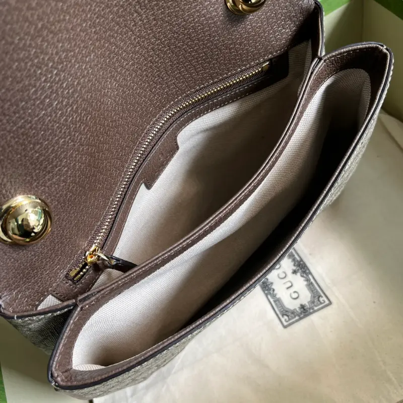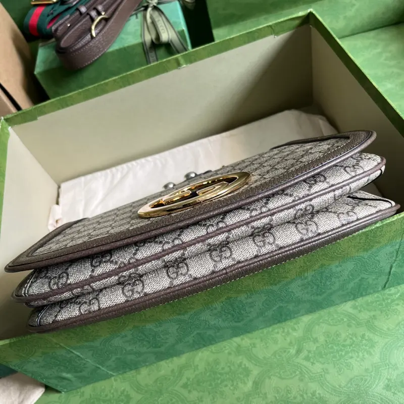 [Includes full original green box packaging] Gbag Blondie medium handbag. The Interlocking G logo is reimagined in geometric shapes, creating a variety of unique pieces. Gold-tone hardware adds a touch of vintage elegance to this piece, showcasing a timeless design that perfectly complements the Hollywood glamour of the runway. This GG Supreme canvas handbag features two interchangeable shoulder straps. Crafted from beige and ebony GG Supreme canvas with brown leather trim, gold-tone hardware, and a cotton and linen lining, it features a round Interlocking G logo. The interior includes two main compartments and a zippered pocket, along with studded handles (12 cm drop), a web bag (52 cm drop), a leather bag (56 cm drop), and a magnetic closure. Model No. 721172. Dimensions: 29 cm (width) x 22 cm (height) x 7 cm (depth). Color: Brown/PVC.