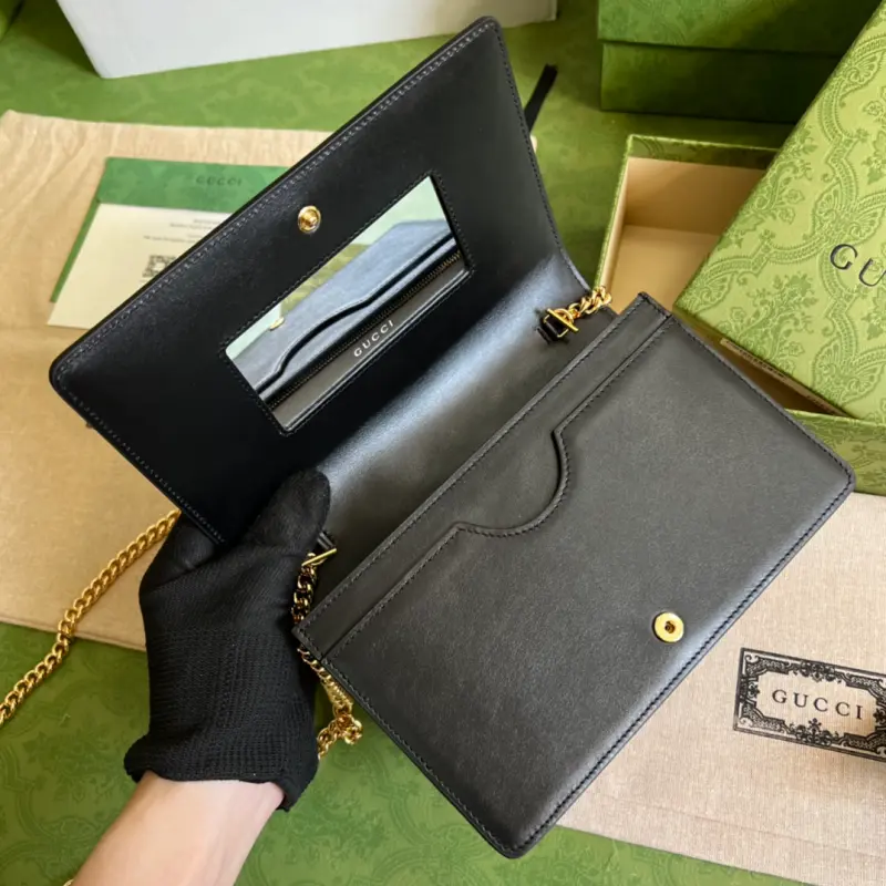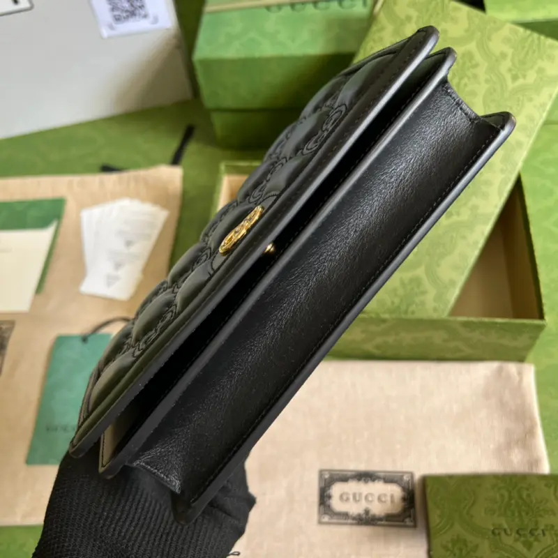 This GG Matelass?? chain bag, featuring quilted leather, offers a soft, textured interpretation of the brand’s signature material. A textured geometric pattern vividly reflects this black chain bag and other small leather accessories. A Double G hardware accents the front, adding a touch of brand identity. Details: Black GG Matelass?? leather. Model No. 723787. Dimensions: 20 x 12.5 x 4 cm. Color: Black/embossed leather.