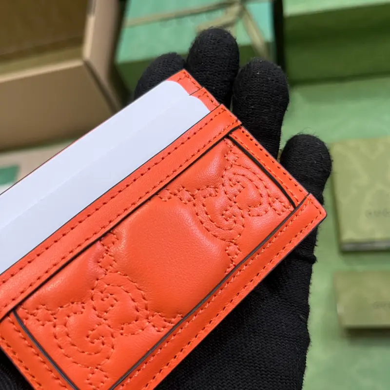This GG Matelass?? card holder, featuring quilted leather, offers a soft, textured interpretation of the brand’s signature material. A textured, geometric pattern is vividly featured on a variety of small leather accessories, including this orange card holder. A Double G hardware accents the front, adding a touch of brand identity. See details. Orange GG Matelass?? leather. Model No. 723790. Dimensions: 10 x 7 cm. Color: Orange/embossed leather.