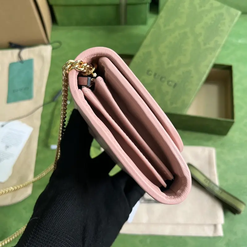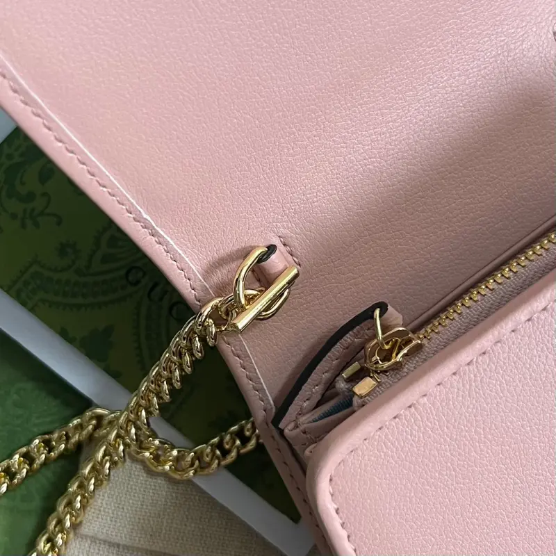 [Comes with full original green box packaging] Detail of how to carry a chain bag (with a full hardware chain). Gbag Blondie interlocking light pink (original leather). I fell in love at first sight! I’ve been waiting so long for this new model! I love it! Used bags have always been my thing, and they’re super popular right now, mainly because they look so good! It’s absolutely amazing! The leather is textured and substantial, and I can change it up anytime, anywhere. I can carry it under my arm or crossbody, depending on my mood. I find both ways so retro and stylish, and they’re truly captivating! Among all the recent styles, this is the only one that has really caught my eye. Model: 725219. Dimensions: 12.5 x 12.5 cm. Color: Light pink/original leather.