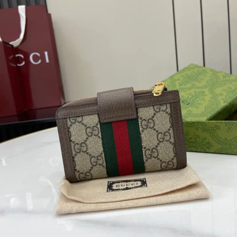 Ophidia GG zip-around wallet, complete with original green box. The GG logo, introduced in the 1970s, evolved from the original Gbag diamond quilting, dating back to the 1930s. This zip-around wallet combines the iconic motif with striped Web, a classic pairing that pays homage to the Gbag brand’s roots. Made of beige/ebony GG Supreme canvas with brown leather trim, red and green Web, gold-tone Double G hardware, a zippered coin pocket, and a zip-around closure. Model No. 725662. Dimensions: 13cm (width) x 8.5cm (height) x 2cm (depth). Color: Brown/PVC.