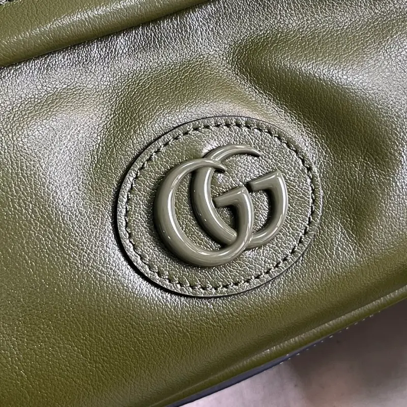 Gbag’s tone-on-tone Double G shoulder bag, complete with original green box packaging. In previous collections, tone-on-tone accessories have been used to adorn small leather goods, and this collection also features on luggage. Enamel details soften the iconic Double G, giving this travel accessory a more understated look. On this green leather shoulder bag, they add an elegant touch of brand identity. Features green leather and green enamel hardware, a red and green web and Original GG canvas lining, and a Double G. Interior: 1 open pocket, exterior: 1 zippered pocket, shoulder strap (47 cm drop) with zipper closure. Weight: Approximately 0.674 kg. Model No. 725696. Dimensions: 23.5 cm (width) x 15.5 cm (height) x 8 cm (depth). Color: Green/Original Green G leather.