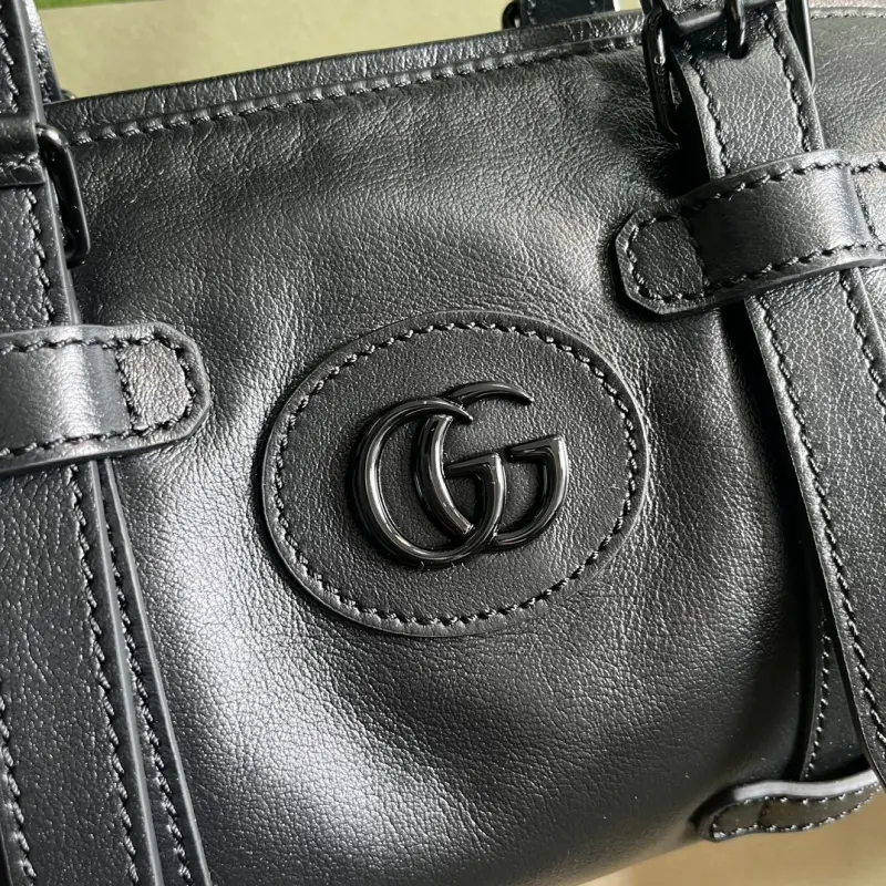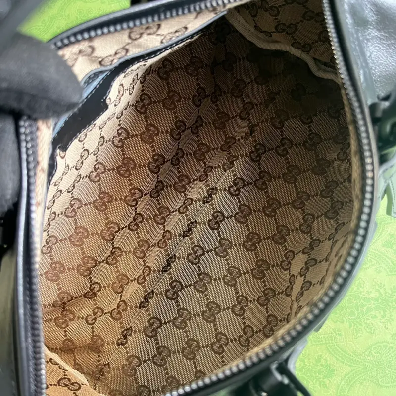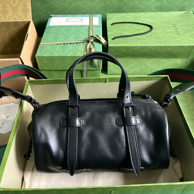small duffel bag adorned with a tonal Double G motif. A decorative element found on small leather goods in previous collections, this tonal accessory makes its debut in the travel luggage collection, adding a touch of allure. Enamel details add a feminine touch to the iconic Double G motif, creating an understated travel accessory. This black leather duffel bag imbues the design with a refined touch of the brand’s signature. Black leather, black enamel hardware, red and green web, and a Double G motif in classic GG canvas lining. Interior: one open pocket, adjustable top handle (8cm drop), detachable shoulder strap (56cm drop), and zip closure. Model No. 725701. Dimensions: 28.5cm (width) x 16cm (height) x 16cm (depth). Color: Black/Black G Original Leather.