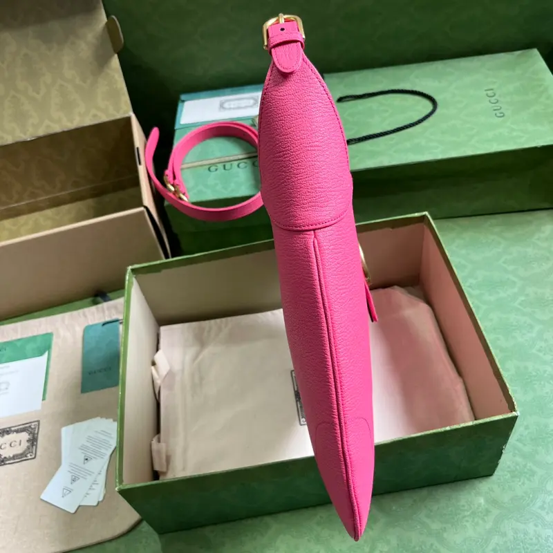 The Gbag Cosmogonie collection debuted in Italy’s historic Castello di Monte. Aesthetic elements from different eras and geographies intertwined, bridging the past and present. This new crescent-shaped shoulder bag, part of the runway collection, draws inspiration from the House’s archives. It’s crafted from soft leather and adorned with the Double G logo, which debuted in the 1970s. Made of soft rose-pink leather with shiny gold-tone hardware, the interior features a zippered pocket, an additional shoulder strap that secures with a buckle, and an adjustable handle with a Double G magnetic clasp. Model No. 726274. Dimensions: 39 (width) x 38 (height) x 2 (depth). Color: Rose-pink/Original Leather.