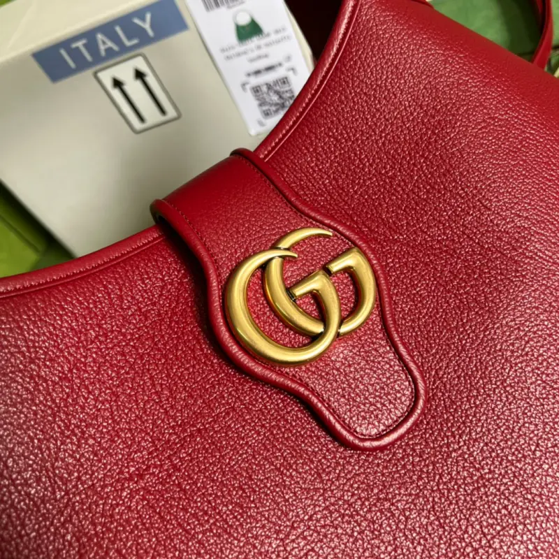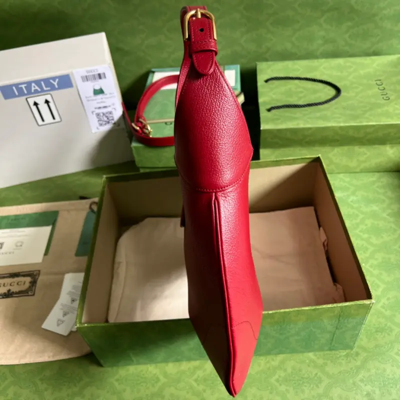The Gbag Cosmogonie collection debuted in Italy’s historic Castello di Monte. Aesthetic elements from different eras and geographies intertwined, bridging the past and present. This new crescent-shaped shoulder bag, part of the runway collection, draws inspiration from the brand’s archives. It’s crafted from soft leather and adorned with the Double G logo, which debuted in the 1970s. Made of soft red leather with shiny gold-tone hardware, the interior features a zippered pocket, an additional shoulder strap that secures with a buckle, and an adjustable handle with a Double G magnetic clasp. Model No. 726274. Dimensions: 39 (width) x 38 (height) x 2 (depth). Color: Red/Original Leather.