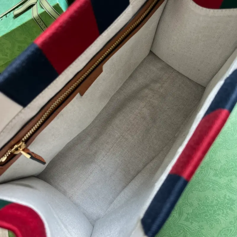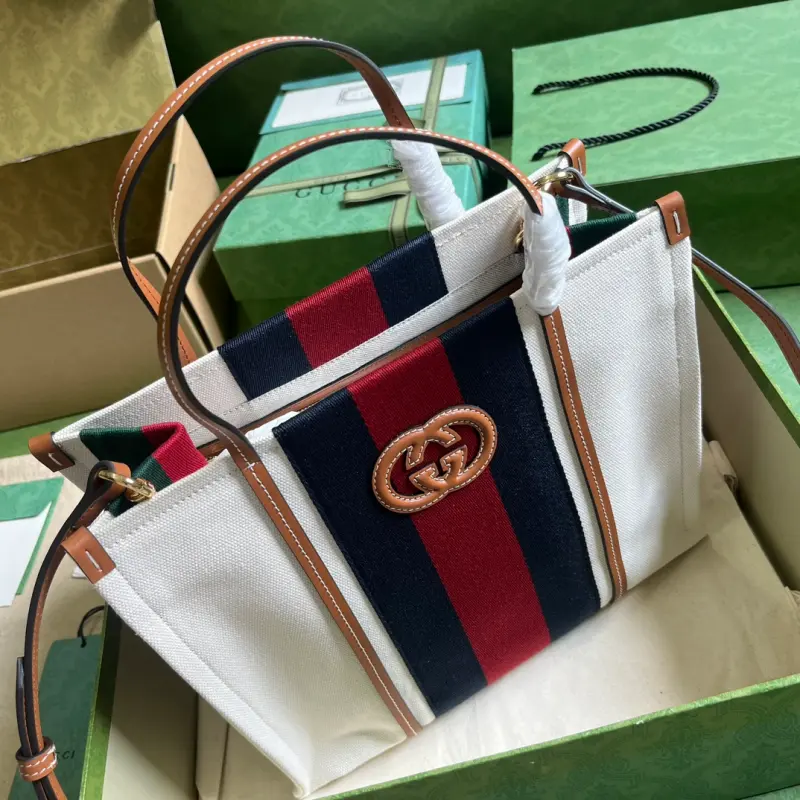 Small Interlocking G tote bag (comes with full original green box packaging). Since its creation in the 1960s, the iconic Interlocking G logo has been a key design element across Gbag collections. Over the years, it has been reinvented in various forms and styles, and this piece is no exception. Here, it complements the striking red and blue Web, creating a timeless allure. Made of white cotton canvas with brown leather trim, red and blue striped Web, and an Interlocking G leather patch. Interior: one zippered pocket, double handles, and a detachable, adjustable shoulder strap. Model No. 727728. Dimensions: 30cm (H) x 25cm (W) x 15cm (D). Color: Brown/Canvas.