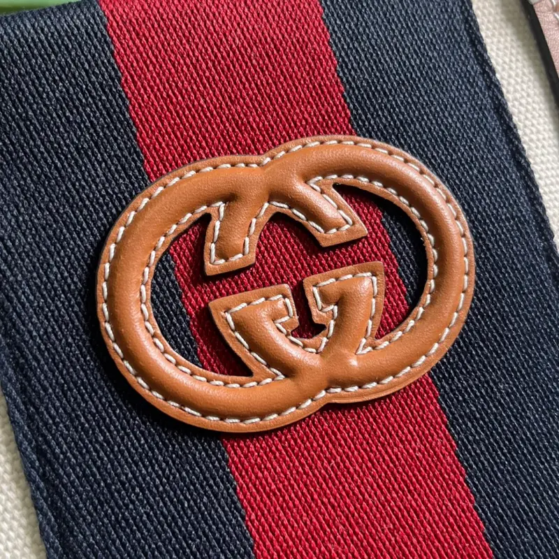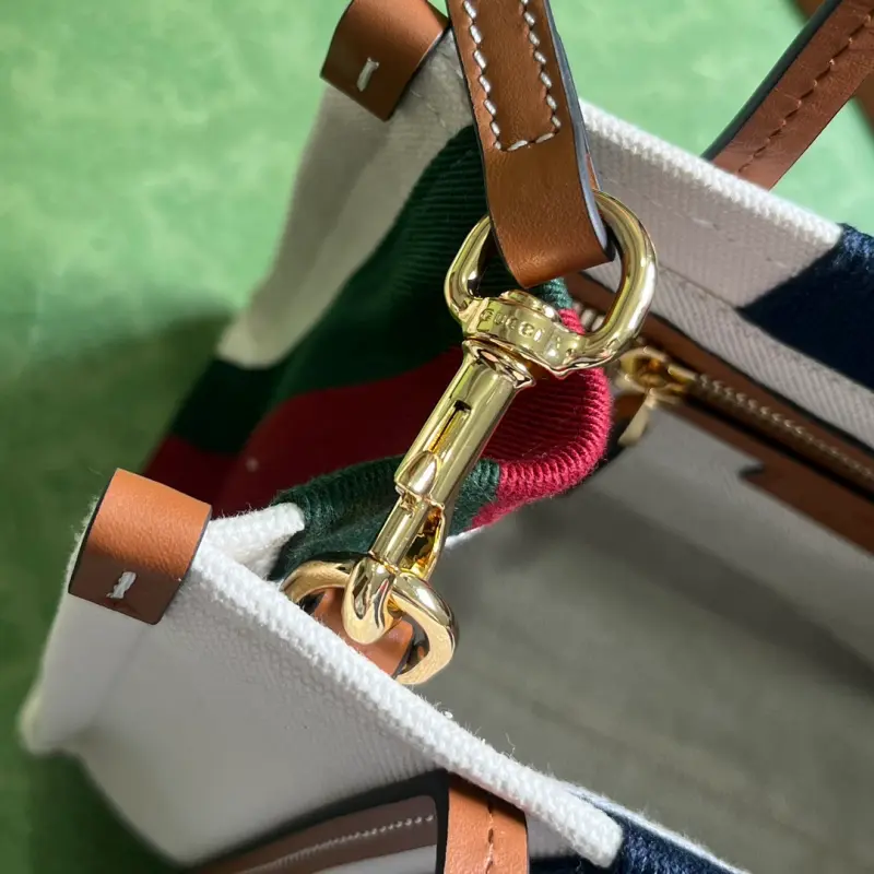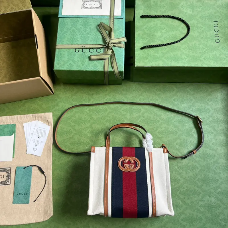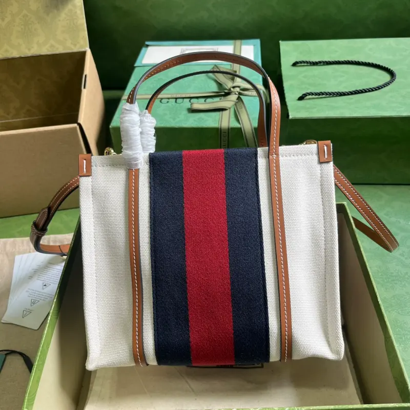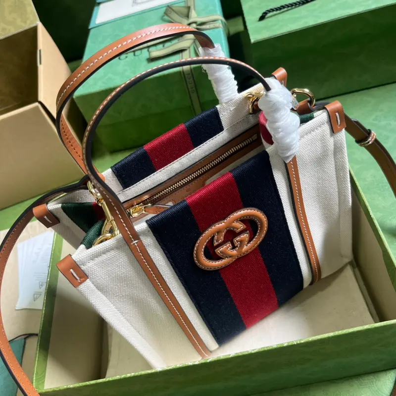 Comes with full original green box packaging. This Interlocking G mini tote bag. Since its creation in the 1960s, the iconic Interlocking G logo has been a key design element throughout Gbag’s collections. Over the years, it has been reinvented in various forms and styles, and this piece is no exception. Here, it’s complemented by the striking red and blue Web, creating a timeless allure. Made of white cotton canvas with brown leather trim, red and blue striped Web, and an Interlocking G leather patch. Interior: one zippered pocket, double handles (10cm drop), and a detachable, adjustable shoulder strap. Model No. 727735. Dimensions: 22.5cm (H) x 18.5cm (W) x 11cm (D). Color: Brown/Canvas.