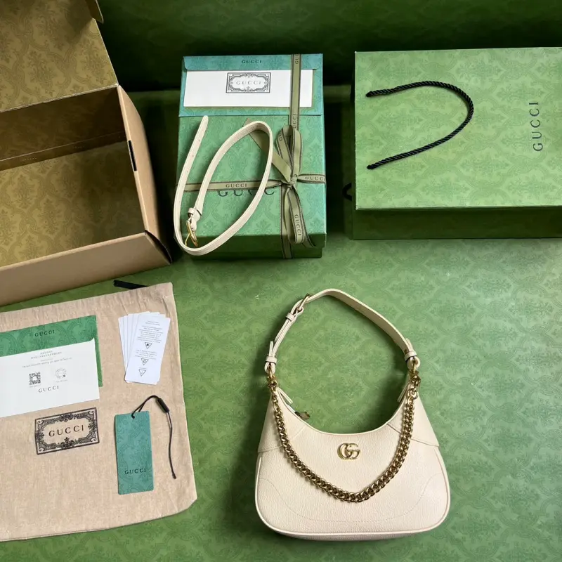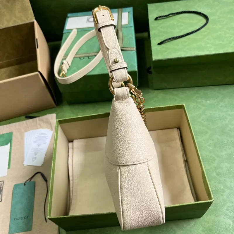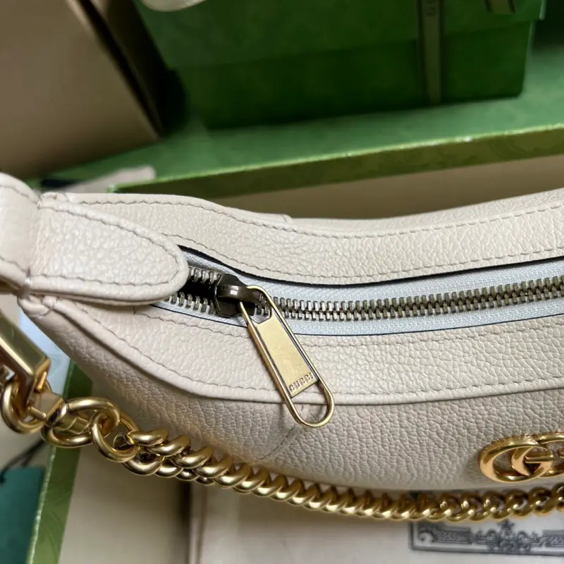 The new GGzp Cosmogonie collection debuted at the historic Castel del Monte in Italy. Aesthetic elements from different eras and geographies intertwined, bridging the past and present. This new small crescent-shaped shoulder bag draws inspiration from the brand’s archives. Crafted from soft leather, it features the Double G logo, which debuted in the 1970s. It comes with two adjustable shoulder straps??one in leather and the other featuring the recognizable GG gold-tone metal chain??embodying the brand’s commitment to practical design. Model No. 731817. Dimensions: 25cm (width) x 19cm (height) x 7cm (depth). Color: Ivory Off-White/Original Leather.