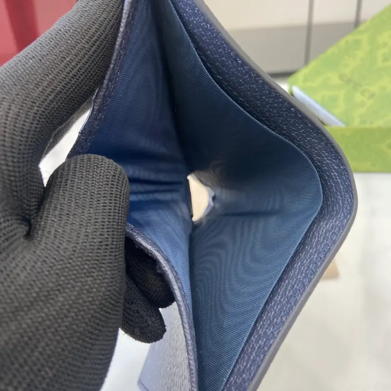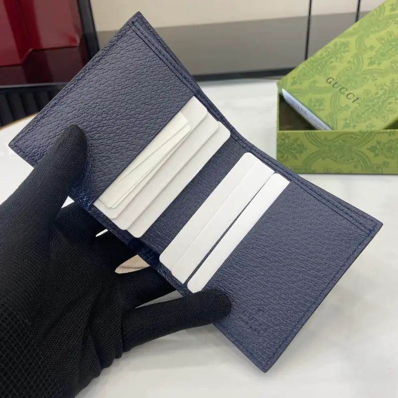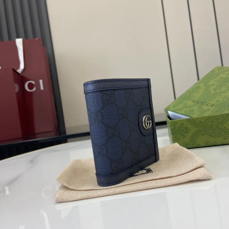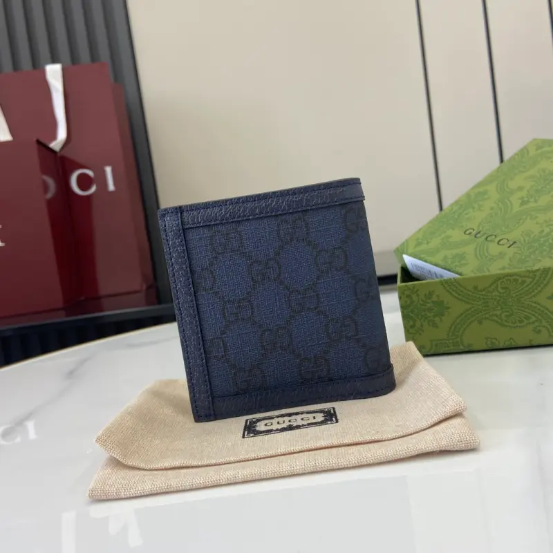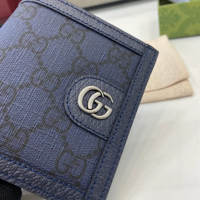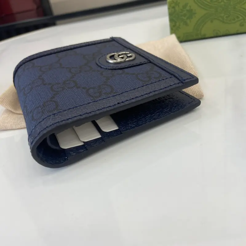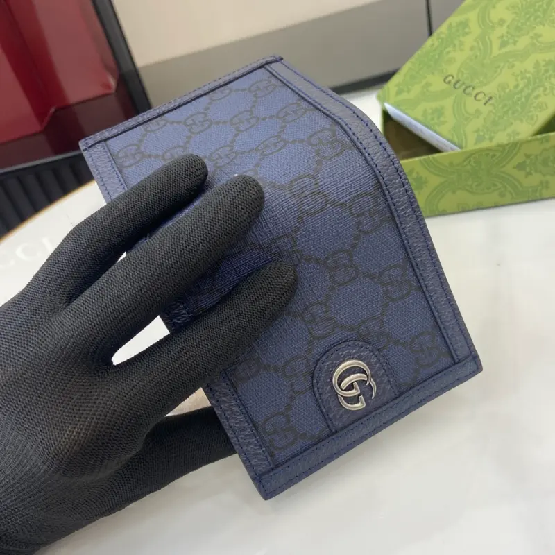 [Includes full original green box packaging] This Ophidia short wallet features the GG logo, an evolution of the Gbag diamond quilting pattern that first appeared in the 1930s and has since become a Gbag staple. This new Ophidia card holder features this recognizable pattern in blue and black. Double G hardware adds a touch of glamour to the look. Made of blue and black GG Supreme canvas with blue leather trim, palladium-tone hardware, and the Double G. Model No. 732016. Dimensions: 10 x 10 cm. Color: Blue/PVC.