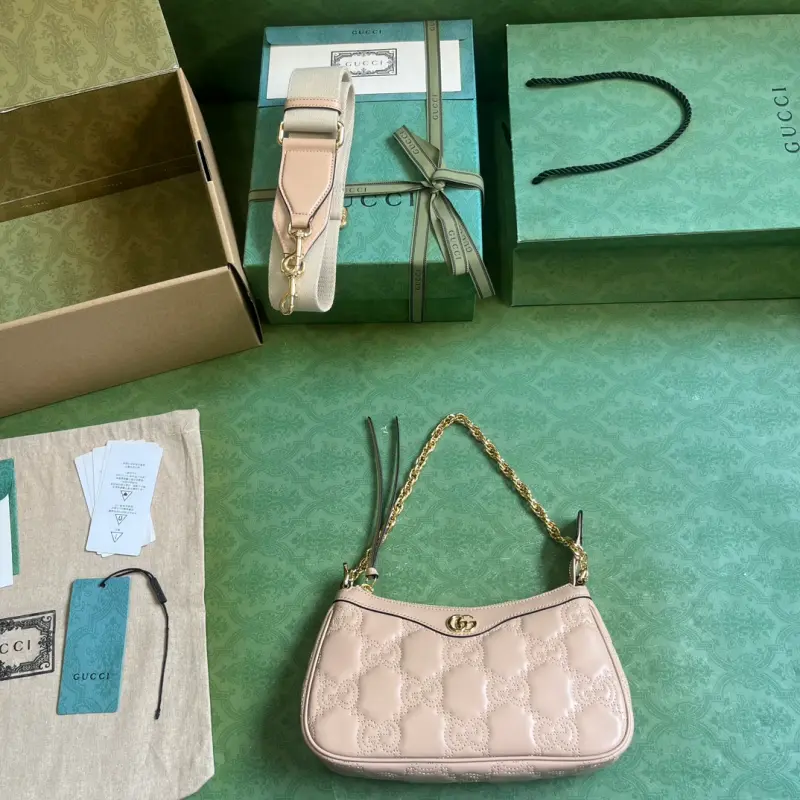 The GG Matelass?? leather handbag, UM8HG 1046, features a soft, textured interpretation of the brand’s signature material. The textured GG motif is vividly featured on a range of bags, including this blush leather bag. A Double G hardware accents the front, adding a touch of brand identity. Made of blush GG Matelass?? leather, with gold-tone hardware, a Double G, and a zipper closure. Two detachable shoulder straps: ivory nylon and gold-tone metal. Model No. 735049. Dimensions: 25cm (width) x 15cm (height) x 8cm (depth). Color: Blush/G-embossed original leather.