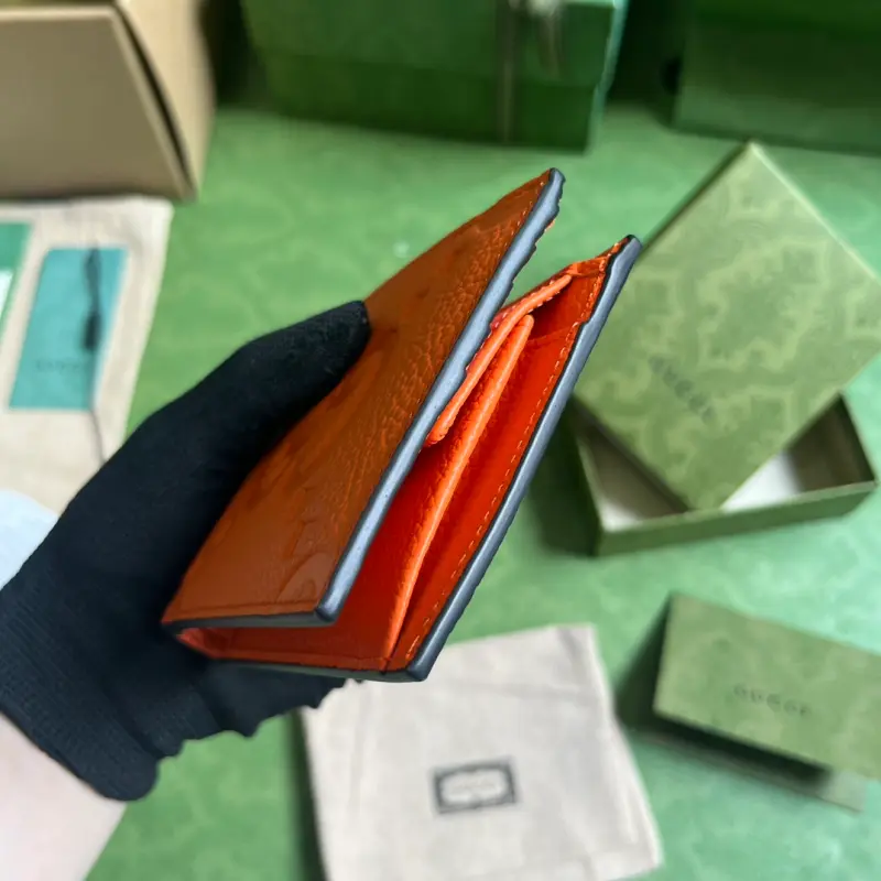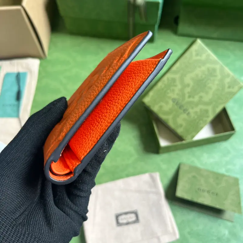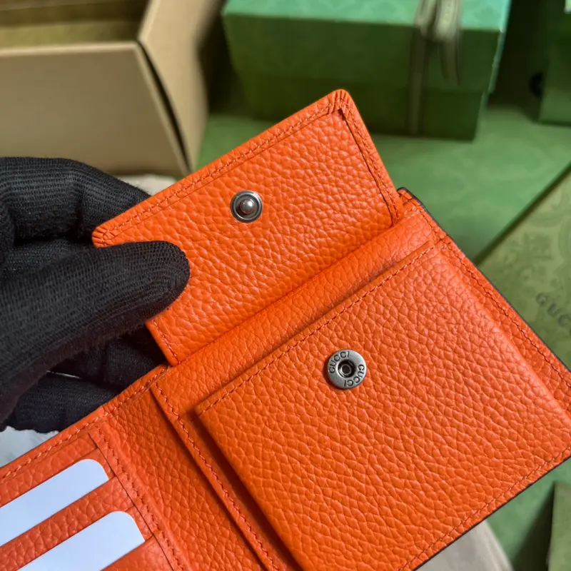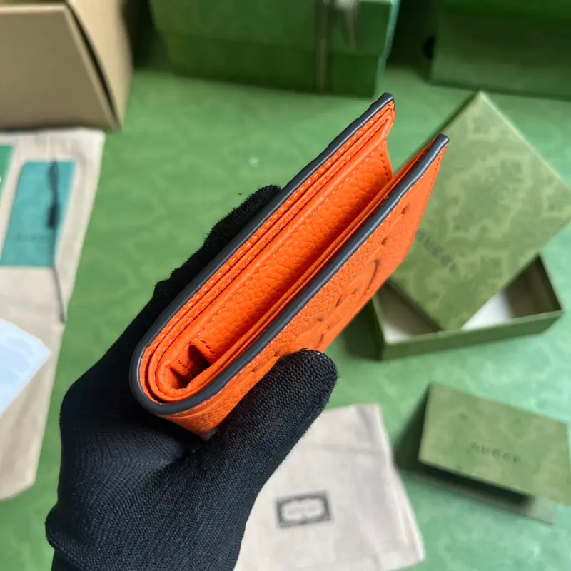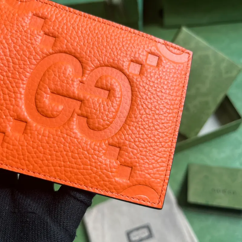 [Includes full original green box packaging] Super Double G wallet. The embossed GG print transforms a small everyday item into a stylish, everyday accessory. Innovative textures and finishes continue to shine in Gbag’s latest collections, showcasing vibrant energy and individuality. This wallet is expertly crafted from orange leather and features an oversized Double G logo throughout. Lined in orange Super Double G leather with a moir?? moir?? pattern, the interior includes four card slots, two bill compartments, and a coin pouch. Model No. 739479. Dimensions (open): 21 cm (width) x 9 cm (height). Dimensions (closed): 11 cm (width) x 9 cm (height). Color: Orange/Original G Embossed Leather.