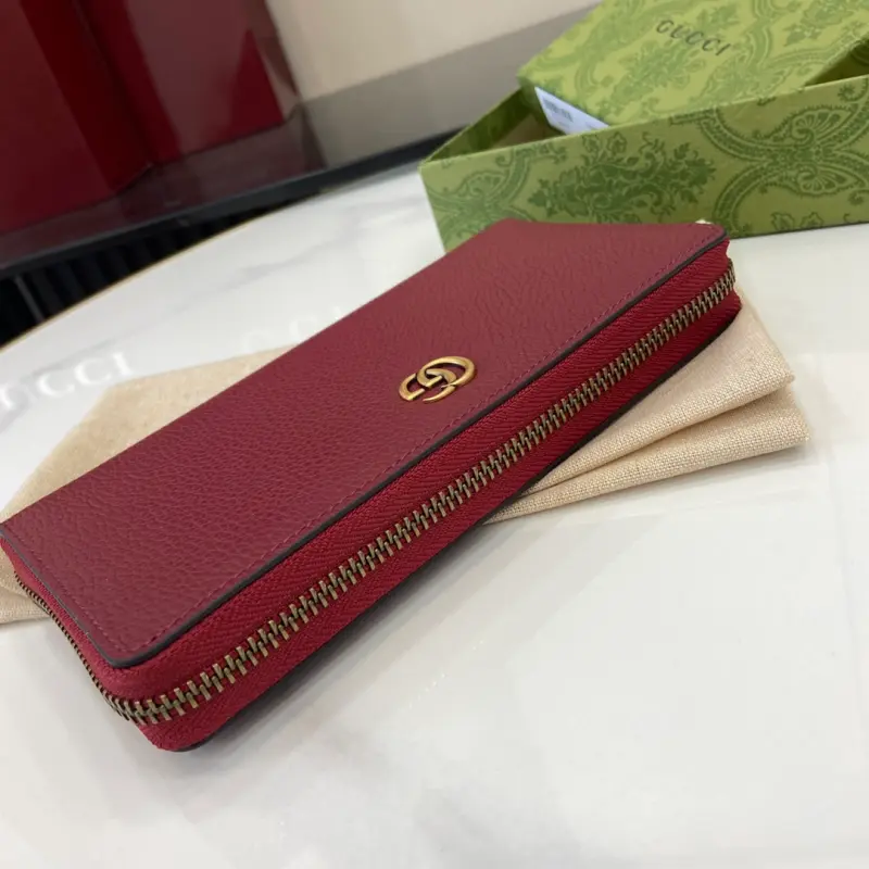 This GG Marmont wallet comes with a complete set of original green packaging. Crafted from timeless black leather, this GG Marmont wallet is a classic addition to the Aria collection. The Double G design, inspired by 1970s belt buckles, is reimagined in tonal resin on this wallet. The classic design is combined with a monochromatic color scheme for a modern and stylish look. Model No. 739499. Dimensions: 19.5 x 11 x 3 cm. Color: Red/Original Leather.