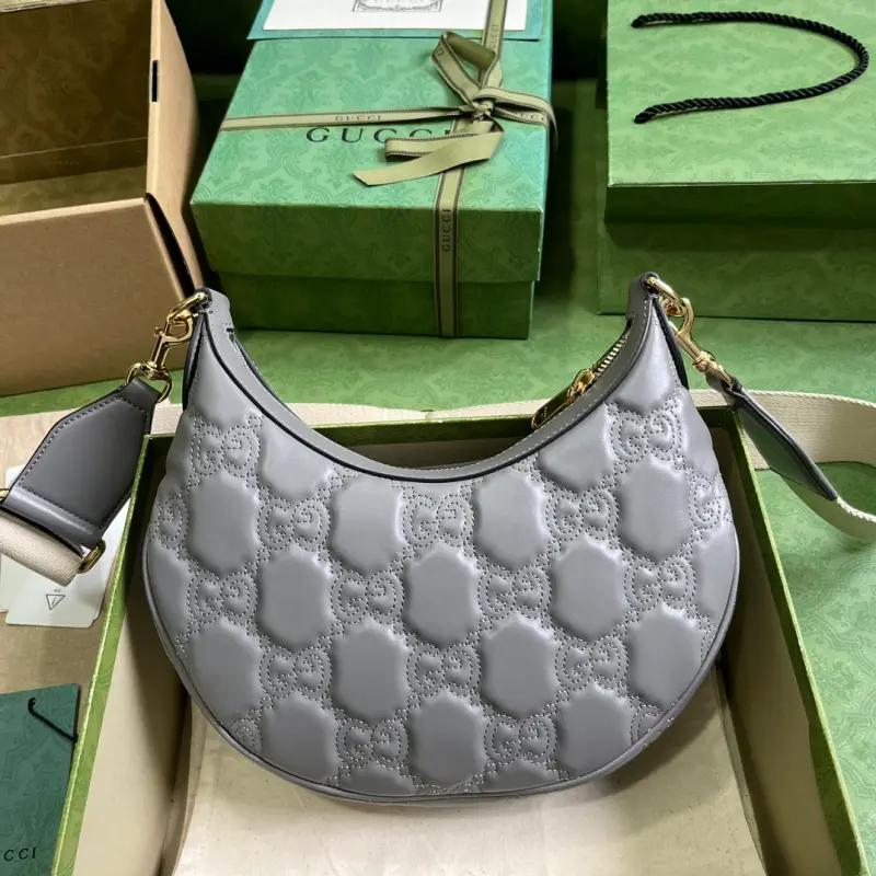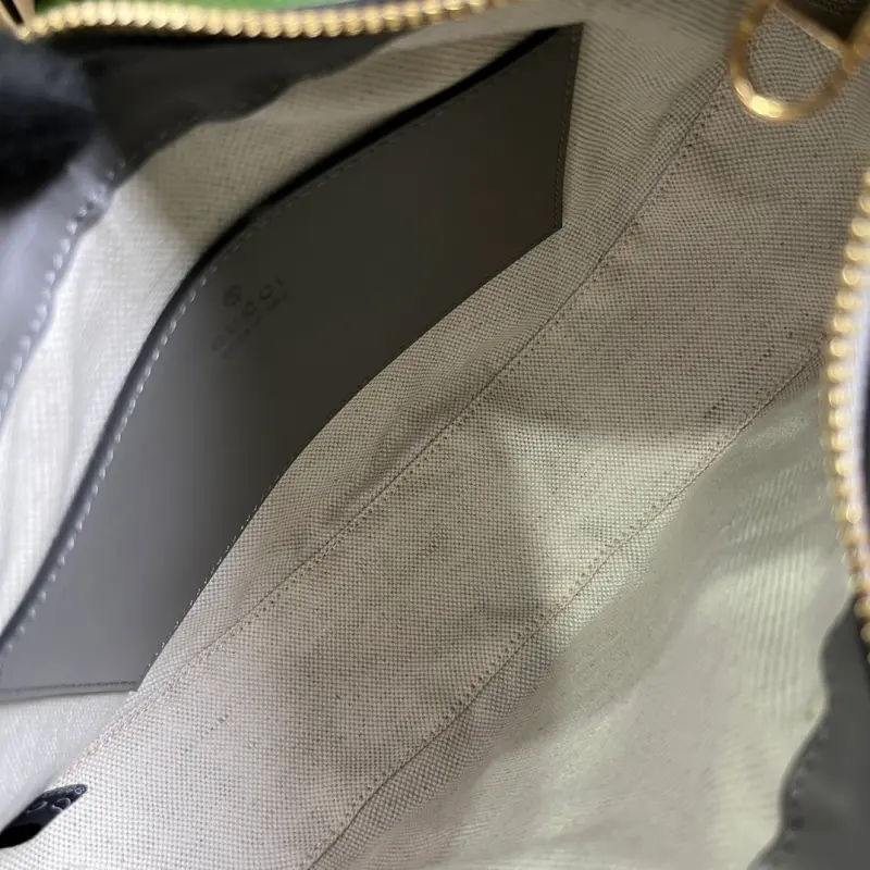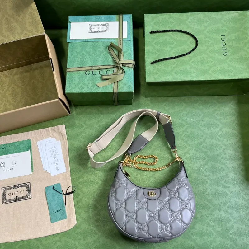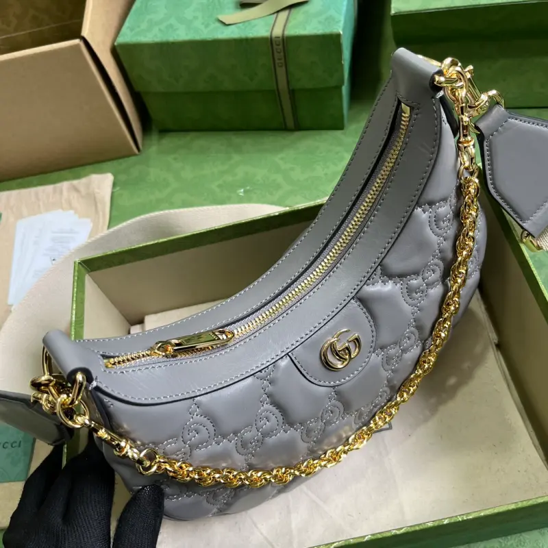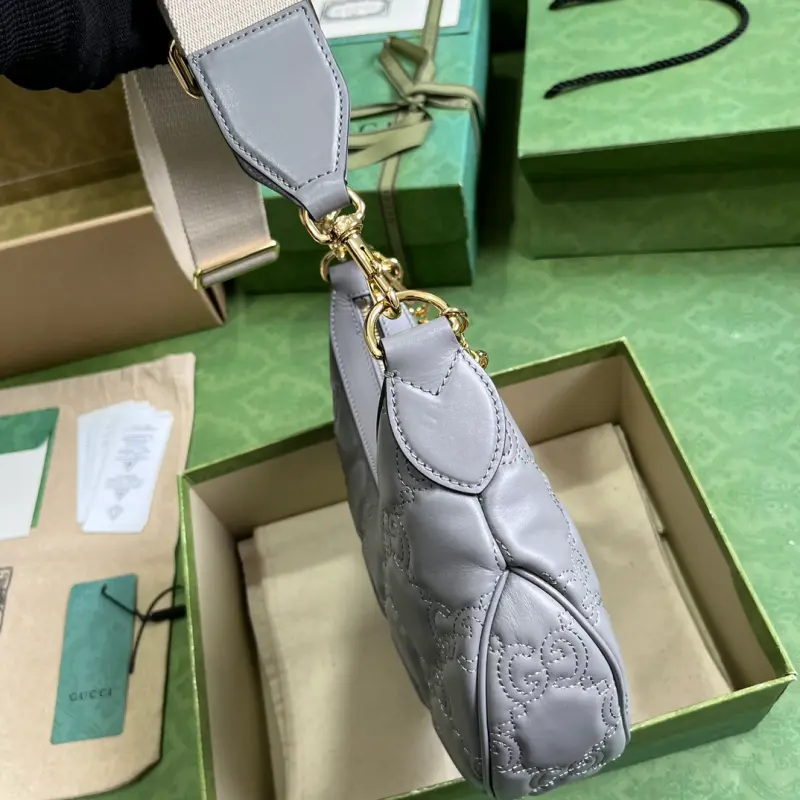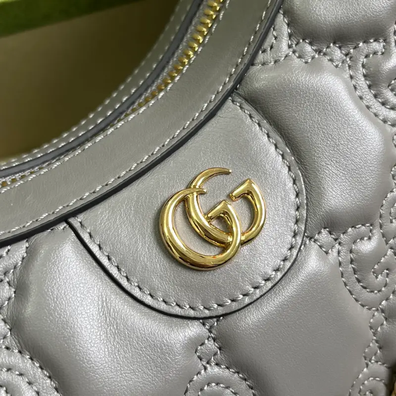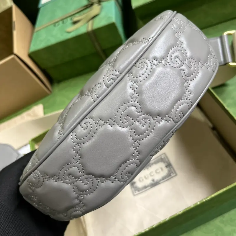 Comes with a complete set of original green box packaging. This small GG Matelass?? shoulder bag features a reimagined, ultra-soft texture in classic Matelass?? leather, showcasing the brand’s recognizable monogram pattern in a fresh perspective. This small shoulder bag features a stylish gray leather silhouette, complemented by a contrasting Double G logo. Made of gray GG Matelass?? leather with gold-tone hardware and a canvas-lined Double G logo, the bag features an interior with one open pocket, a chain shoulder strap (33 cm drop), an adjustable canvas shoulder strap (66 cm drop), and a zipper closure. Model No. 739709. Dimensions: 27 cm (width) x 18 cm (height) x 7 cm (depth). Color: Gray/Original G embossed leather.