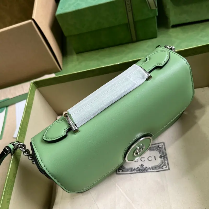 Comes with a complete set of original green box packaging. This Petite GG mini shoulder bag features a soft yet structured shape, a top zip closure, and a subtle Double G motif. The adjustable leather shoulder strap allows it to be worn crossbody, and classic white leather accents the collection’s signature monogram. Made of green leather with palladium-tone hardware featuring the Double G. Interior: one zippered pocket, an adjustable and removable leather shoulder strap (45 cm drop), and a magnetic snap fastening. Model No. 739722. Dimensions: 21 cm (width) x 10 cm (height) x 5 cm (depth). Color: Green/Original Leather.