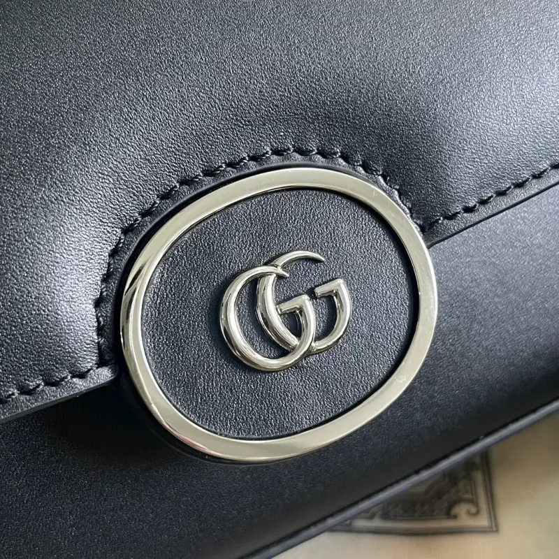 Comes with a complete set of original green box packaging. This Petite GG mini shoulder bag features a soft yet structured shape, a top zip closure, and a subtle Double G motif. The adjustable leather shoulder strap allows it to be worn crossbody. Classic white leather accentuates the collection’s signature monogram. Made of black leather with palladium-tone hardware featuring the Double G. Interior: one zippered pocket, an adjustable and removable leather shoulder strap (45 cm drop), and a magnetic snap closure. Model No. 739722. Dimensions: 21 cm (width) x 10 cm (height) x 5 cm (depth). Color: Black/Original Leather.