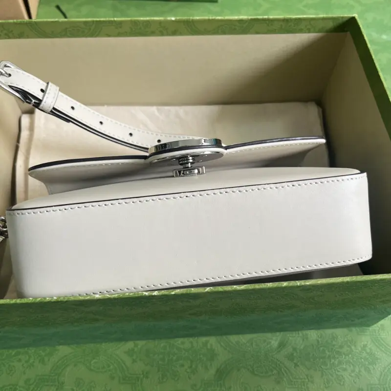 Comes with a complete set of original green box packaging. This Petite GG mini shoulder bag features a soft yet structured shape, a top zip closure, and a subtle Double G motif. The adjustable leather shoulder strap allows it to be worn crossbody, and classic white leather accents the collection’s signature monogram. Made of white leather with palladium-tone hardware featuring the Double G. Interior: one zippered pocket, an adjustable and removable leather shoulder strap (45 cm drop), and a magnetic snap fastening. Model No. 739722. Dimensions: 21 cm (width) x 10 cm (height) x 5 cm (depth). Color: White/original leather.