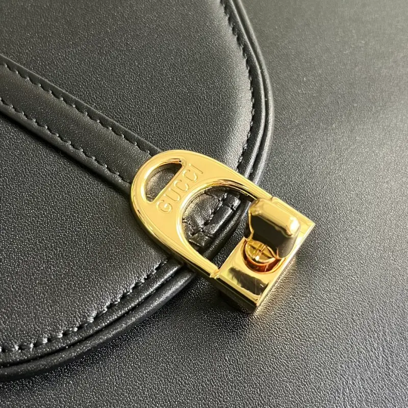 Equestrian-inspired shoulder bag. Gbag pays homage to its roots, exploring classic equestrian silhouettes in a fresh light. This shoulder bag instantly adds a vintage touch to any look, showcasing the brand’s heritage in two distinct ways: inspired by its core equestrian roots and crafted through exquisite leather craftsmanship. Made of black leather with gold-tone hardware and leather lining, it features an equestrian-inspired flap. Interior: one open pocket, one zippered pocket, shoulder strap (45 cm drop) with Gbag clip and lock closure. Weight: approximately 0.57 kg. Model No. 740988. Dimensions: 21 cm (width) x 20 cm (height) x 7 cm (depth). Color: Black/Original Leather.