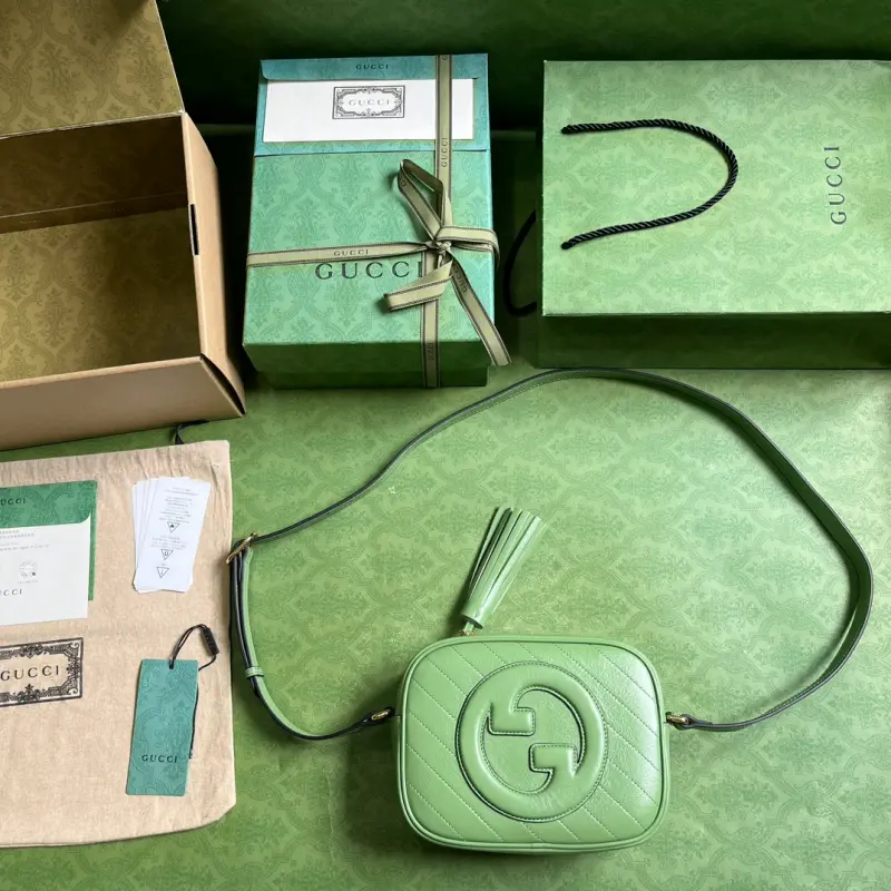 This small Gbag Blondie shoulder bag, featuring a round Interlocking GG design from the brand’s archives, is a masterful interpretation of the Gbag Blondie collection. This classic Gbag Blondie shoulder bag and crossbody bag are embellished with exquisite leather appliqu??s, reinterpreting the brand’s heritage. This light green leather item is a select item with a Gbag Authenticity Tag, NFC-enabled for authenticity verification and a digital innovation. It features a round Interlocking GG leather appliqu??, side tassel detailing, and a shoulder strap (54.5 cm height) with a zipper closure. Model No. 742360. Dimensions: 21 cm (width) x 15.5 cm (height) x 5 cm (depth). Color: Light Green/Original Leather.