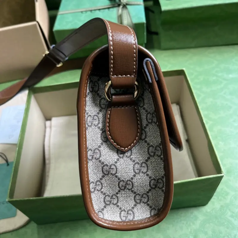 This GG messenger bag, featuring the Interlocking GG print, comes in a complete set of original green box packaging. The GG motif and Interlocking GG logo details are cleverly integrated throughout the Pre-Fall 2023 travel luggage collection. The new messenger bag combines a fresh silhouette with everyday functionality, showcasing Gbag’s modern vision while paying homage to traditional aesthetics. This messenger bag is crafted from classic beige and ebony GG Supreme canvas with brown leather trim. It features beige and ebony GG Supreme canvas with brown leather trim, a cotton and linen lining, an oval Interlocking GG leather plaque, and interior features one zippered pocket, one buttoned pocket, an adjustable shoulder strap (53.8 cm drop), and a magnetic flap closure. Model No. 745679. Dimensions: 25.4 cm (width) x 17 cm (height) x 7.8 cm (depth). Color: Brown/PVC.