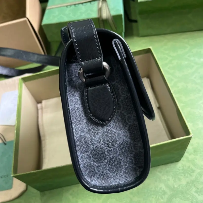 This GG messenger bag, featuring the Interlocking GG print, comes in a complete set of original green box packaging. The GG motif and Interlocking GG logo details are cleverly integrated throughout the Pre-Fall 2023 travel luggage collection. The new messenger bag combines a fresh silhouette with everyday functionality, showcasing Gbag’s modern vision while paying homage to traditional aesthetics. This messenger bag is crafted from classic beige and ebony GG Supreme canvas with black leather trim. It features beige and ebony GG Supreme canvas with black leather trim, a cotton and linen lining, an oval Interlocking GG leather plaque, and interior features one zippered pocket, one buttoned pocket, an adjustable shoulder strap (53.8 cm drop), and a magnetic flap closure. Model No. 745679. Dimensions: 25.4 cm (width) x 17 cm (height) x 7.8 cm (depth). Color: Black/PVC.