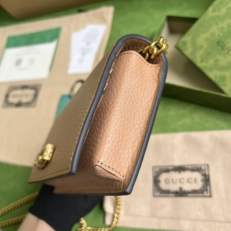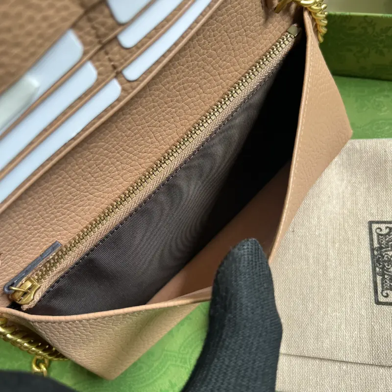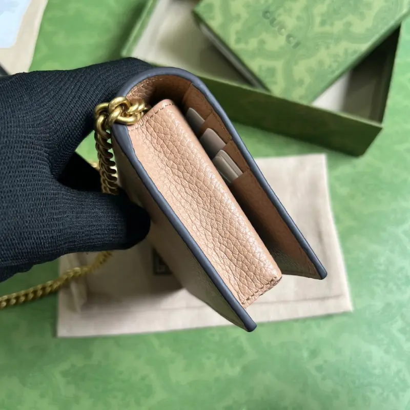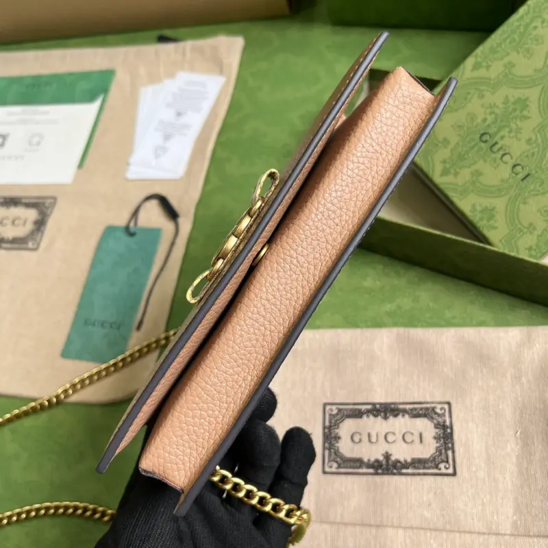 Comes with a complete set of original green box packaging. This wallet features an Interlocking G python bow and chain. Crafted from rose beige leather, this wallet features a front bow with python trim and gold-tone Interlocking G detailing. The chain shoulder strap allows for versatile carrying options. This iconic piece features six card slots, one open pocket, and one zippered pocket. Made of rose beige leather with natural python trim, gold-tone hardware, suede and moir?? fabric lining, and Interlocking G python bow detailing. The interior includes six card slots, one zippered pocket, one open pocket, and a chain shoulder strap (60 cm drop) with a snap button closure. Weight: Approximately 0.31 kg. Model No. 746056. Dimensions: 19 cm (width) x 10 cm (height) x 4 cm (depth). Color: Rose beige/original leather.