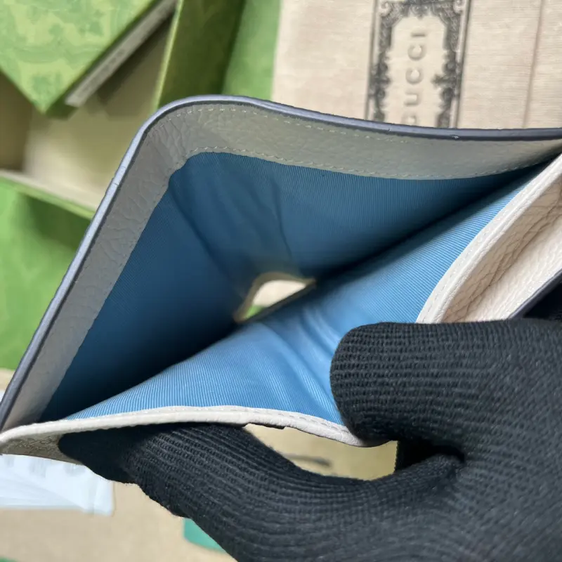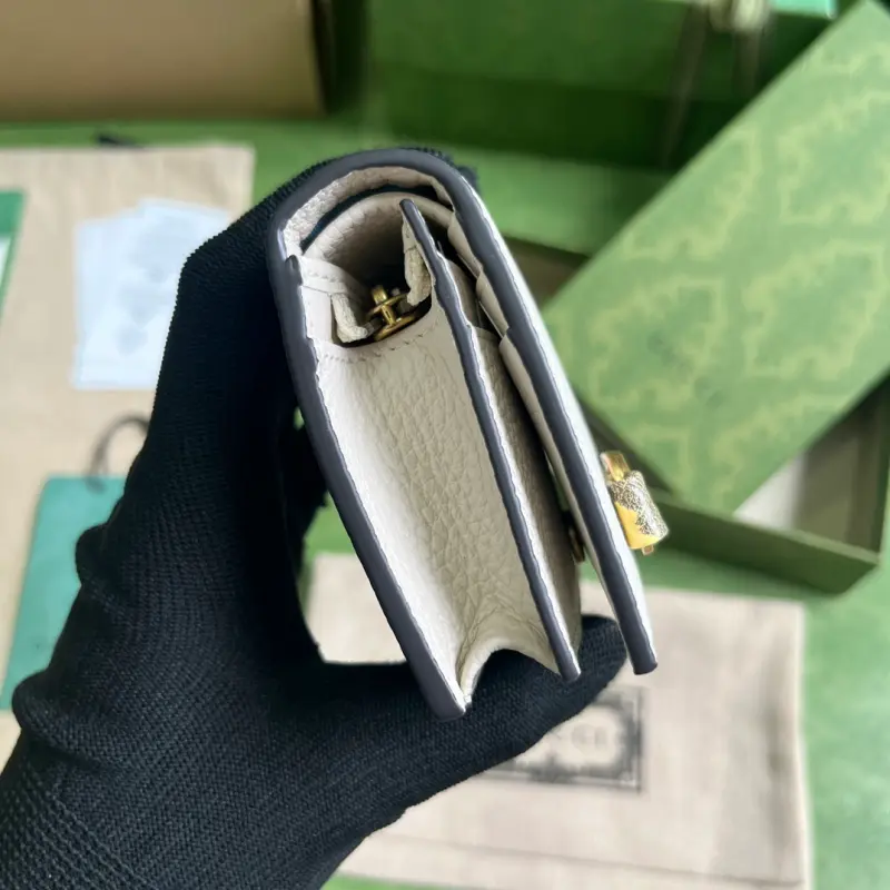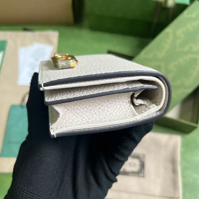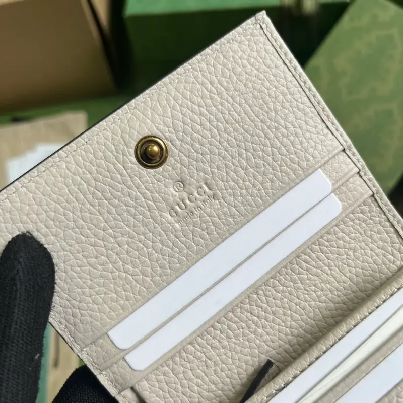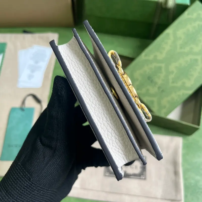 Comes with a complete set of original green box packaging. This wallet features an Interlocking G python bow. Crafted from rose-beige leather, this wallet features a front bow with python trim and gold-tone Interlocking G detailing. This iconic piece features five card slots, one open pocket, and one zippered pocket. It features white leather with natural python trim, gold-tone hardware, a moir?? fabric lining, and an Interlocking G python bow detail. The interior includes five card slots, one open pocket, and one zippered pocket with a snap button closure. Weight: approximately 0.18 kg. Model No. 746059. Dimensions when closed: 11 cm (width) x 8.5 cm (height) x 3 cm (depth). Dimensions when open: 11 cm (width) x 17.5 cm (height). Color: White/original leather.