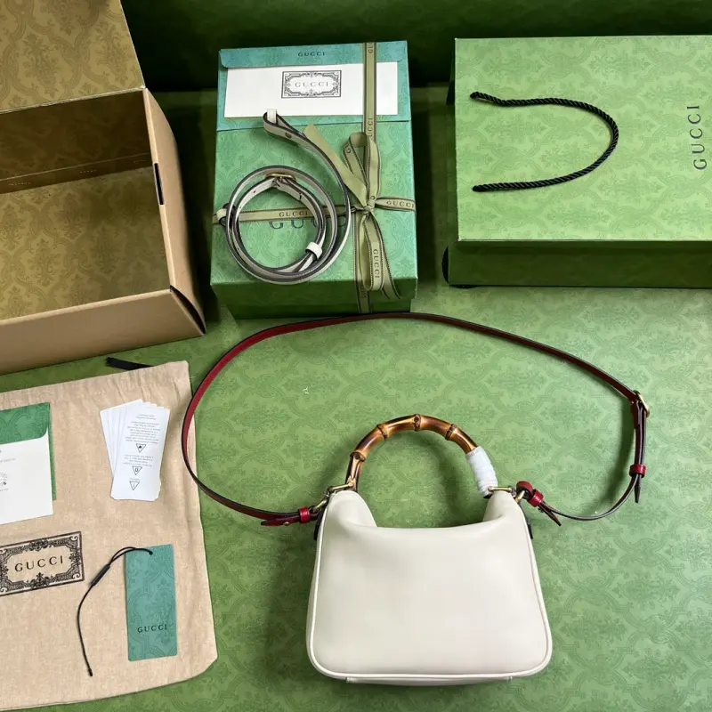 Comes with full original green box packaging. This Gbag Diana Bamboo Small Shoulder Bag features two recognizable brand elements: bamboo handles and Double G hardware. Crafted from white leather, this accessory features a contrasting white leather shoulder strap, adding a touch of class. Features white leather trim, gold-tone hardware, a microfiber suede lining, a Double G, and a separate leather shoulder strap. Interior: one zippered pocket, bamboo handles (11 cm drop), and a detachable, adjustable shoulder strap (52 cm drop) with a magnetic clasp. Model No. 746251. Small dimensions: 24 cm (width) x 15 cm (height) x 5 cm (depth). Color: White/Original Leather.