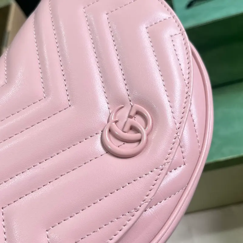 GG Marmont quilted chain mini bag. Gbag’s classic small accessory continues to revitalize itself within the brand’s evolving aesthetic. This GG Marmont mini bag, crafted in an elegant pink, is enhanced with matching hardware. Features light pink quilted V-pattern leather, light pink palladium hardware with a ceramic-effect finish, and a suede-like moir?? fabric and microfiber blend lining with a Double G. Interior: two card slots, a hook closure, and a chain shoulder strap (57 cm drop) with a snap button fastening. Model No. 746431. Dimensions: 14.5 cm (length) x 20 cm (width) x 4 cm (depth). Color: Light pink/original leather.
