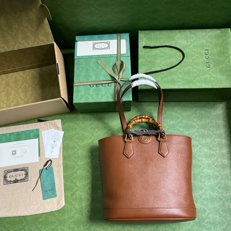 Gbag Diana Medium Bamboo Tote Bag (Includes Full Original Green Box). The Gbag Diana Bamboo Bag reflects the brand’s evolving and revitalized design philosophy, offering a fresh take on the classic bamboo tote from the ’90s. This tote features a spacious interior crafted from natural soft leather and two foldable leather handles, allowing it to be worn as a shoulder bag or a handbag, offering a variety of styling options. Made of natural leather with gold-tone hardware, this bag comes with two decorative leather handles and buckles, as shown. The interior features two main compartments and a zippered pocket, along with double bamboo handles (9cm drop) and double leather handles (27cm drop). Model No. 750394. Dimensions: 31cm (width) x 27cm (height) x 15cm (depth). Color: Brown/Original Leather.