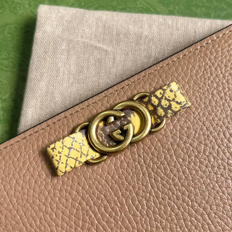 Comes with a complete set of original green box packaging. This long wallet features an Interlocking G python bow. Crafted from rose beige leather, this long wallet features a front bow with python trim and gold-tone Interlocking G detailing. This iconic piece features 12 card slots and a zippered coin pocket with a snap closure. Made of rose beige leather with natural python trim, gold-tone hardware, a moir?? fabric lining, and an Interlocking G python bow detail. The interior includes 12 card slots, two bill compartments, two separate interior compartments, and a zippered coin pocket. Model No. 750458. Dimensions: 19cm (W) x 10cm (H) x 3.5cm (D). Color: Rose Beige/Original Leather.