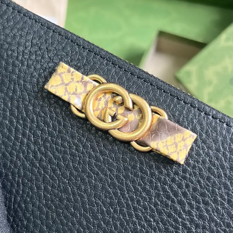 Comes with a complete set of original green box packaging. This long wallet features an Interlocking G python bow. Crafted from black leather, this long wallet features a front bow with python trim and gold-tone Interlocking G detailing. This iconic piece features 12 card slots and a zippered coin pocket with a snap closure. Black leather with natural python trim, gold-tone hardware, a moir?? fabric lining, and an Interlocking G python bow detail. The interior includes 12 card slots, two bill compartments, two separate interior compartments, and a zippered coin pocket. Model No. 750458. Dimensions: 19cm (W) x 10cm (H) x 3.5cm (D). Color: Black/Original Leather.