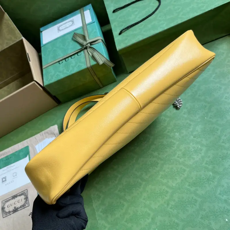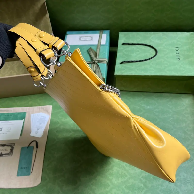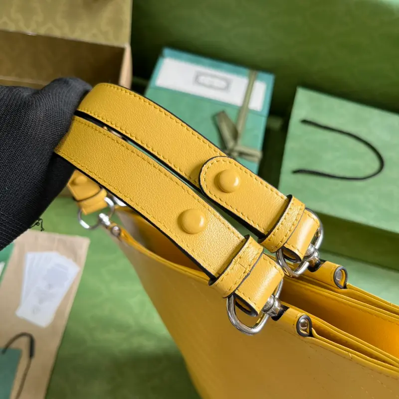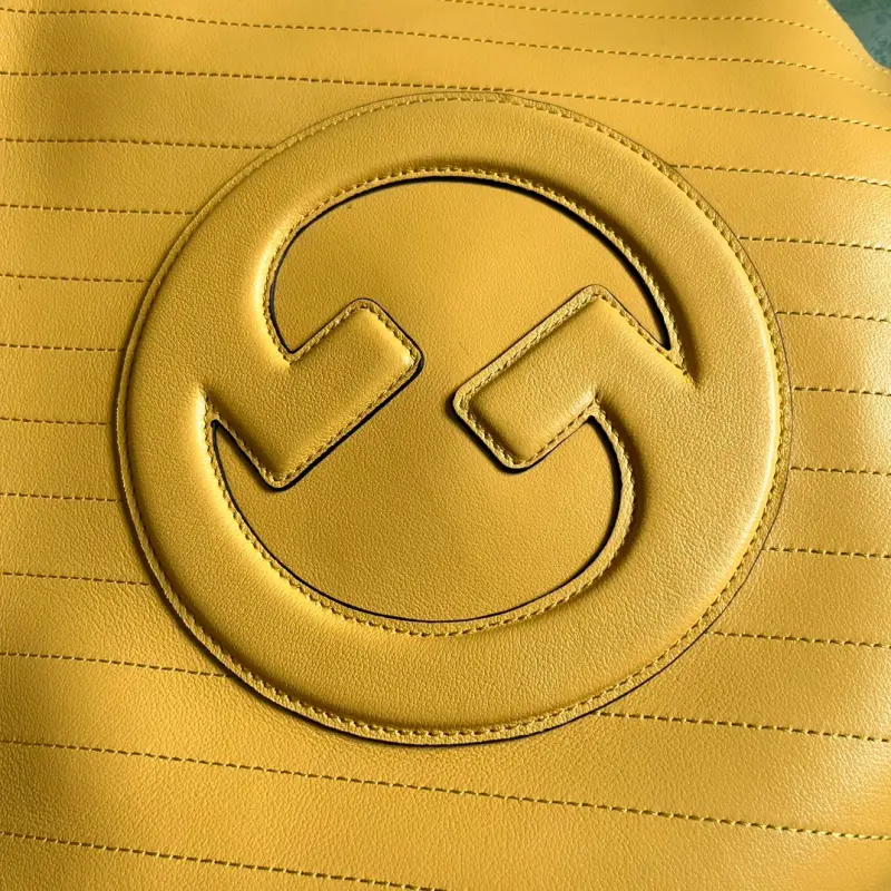Comes with a complete set of original green box packaging. This Gbag Blondie medium tote bag is ingeniously embellished with a circular interlocking GG design inspired by a symbolic element from the brand’s archives. This Gbag Blondie tote features a top handle and a chain shoulder strap, and is prominently embellished with the brand’s signature crafted from a leather patch. It is lined with yellow leather and cotton and linen, and features a circular interlocking GG leather patch. The interior includes three main compartments and a zippered pocket, a top handle (20 cm drop), and a chain shoulder strap (42 cm drop). Weight: Approximately 1.2 kg. Model No. 751516. Dimensions: 34.5 cm (length) x 41 cm (width) x 8 cm (depth). Color: Yellow/Original Leather.