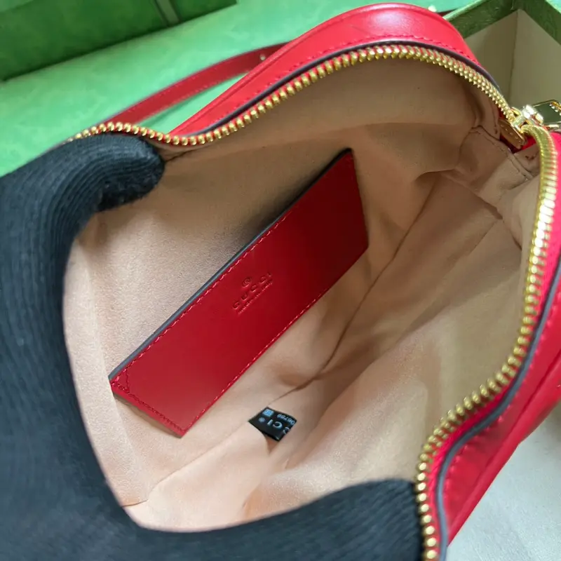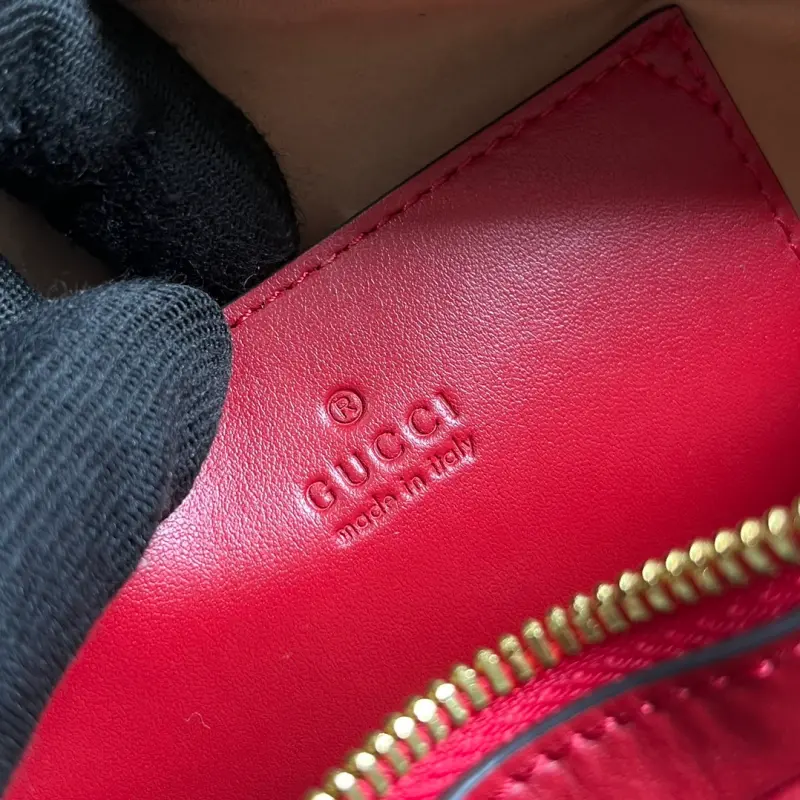 Comes with full original green box packaging. This Interlocking G mini heart shoulder bag features an Interlocking G theme inspired by past and present. Featuring diagonal Marbella leather, the concentric design gives this mini shoulder bag a whimsical twist. Made of red diagonal Marbella leather with shiny gold-tone Interlocking G hardware, it features one open interior pocket and one zippered exterior pocket. It also has a detachable 21.7-inch leather strap with a zipper closure. Model No. 751628. Dimensions: 20cm (width) x 17.5cm (height) x 6.5cm (depth). Color: Red/Original Leather.