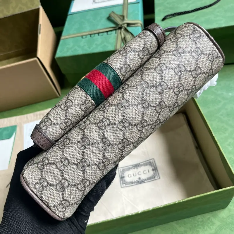 The Ophidia GG toiletry bag, complete with original green box packaging, is a striking new creation from the Ophidia collection, blending Gbag’s heritage with contemporary design. Embracing iconic details like the Web and Double G hardware, the collection is reimagined in innovative shapes and sizes for the Pre-Fall collection. This men’s toiletry bag showcases the subtle beauty of elegant lines, featuring a front zippered pocket and a single side handle. Made of beige and ebony GG Supreme canvas with brown leather trim, gold-tone hardware, a red and green Web, a nylon-lined Double G, a front zippered pocket, side handles, and a zipper closure. Model No. 751811. Dimensions: 26.4cm (width) x 11cm (height) x 2cm (depth). Color: Brown/PVC.