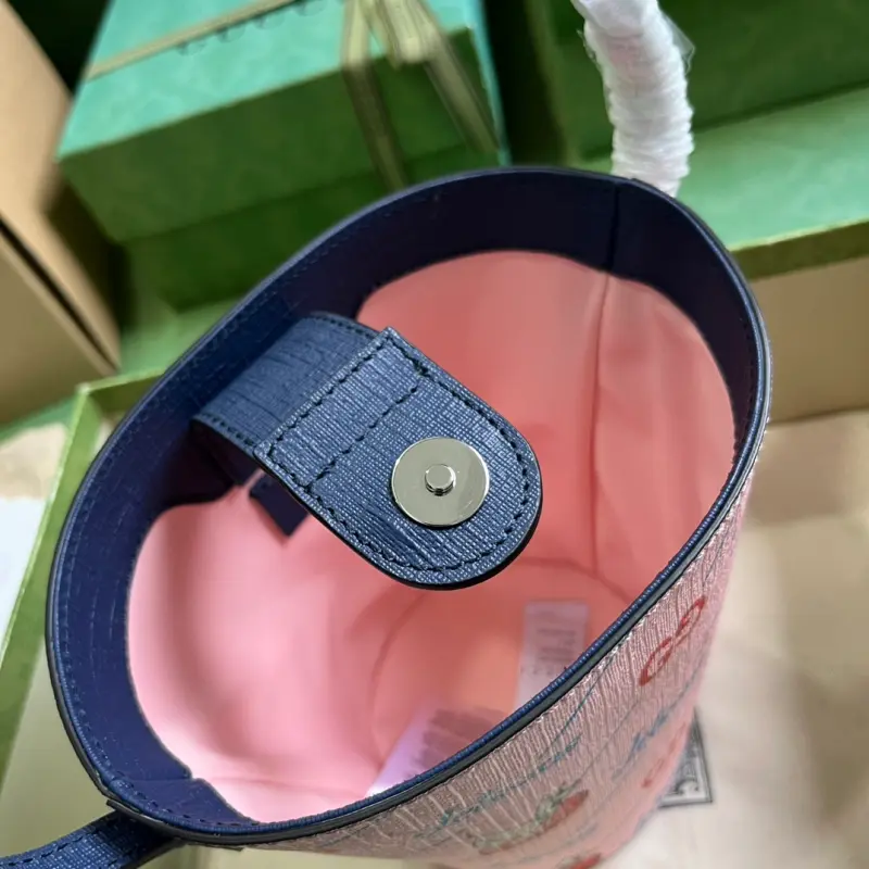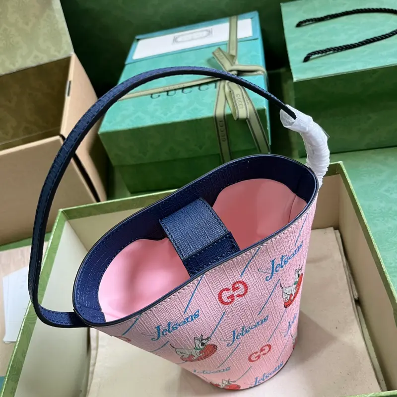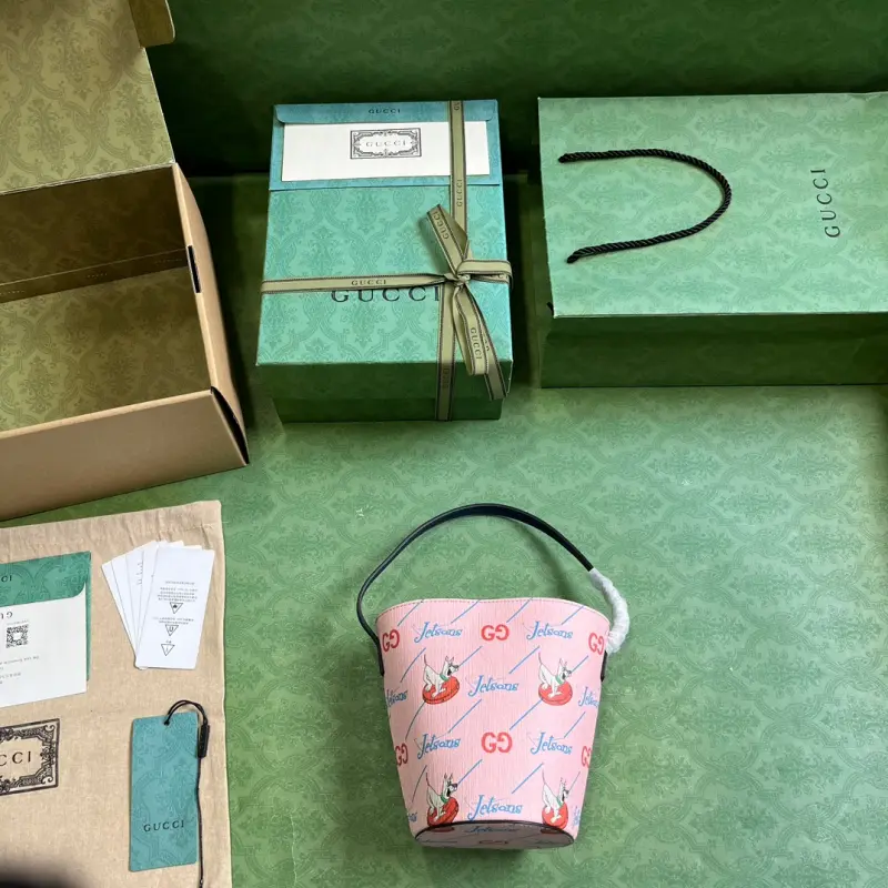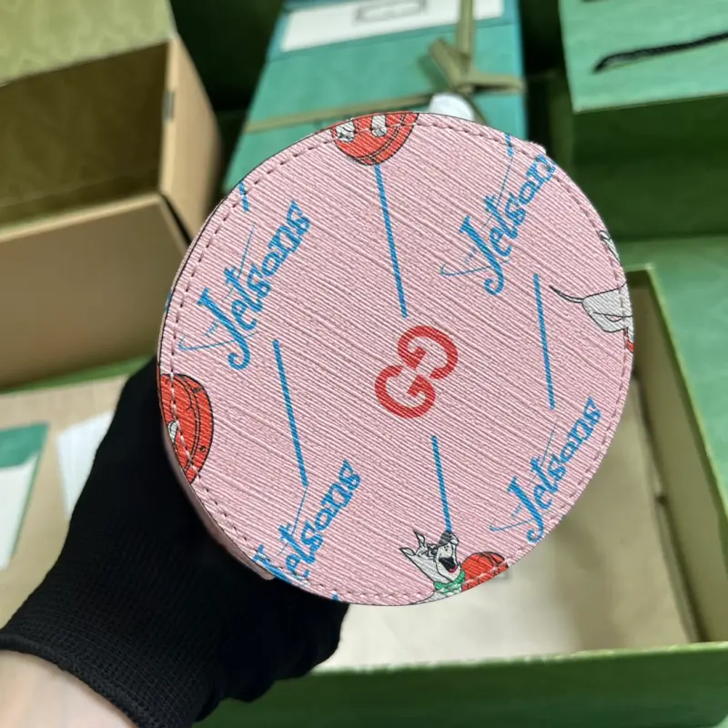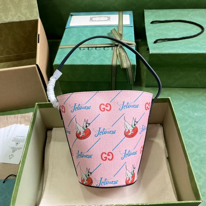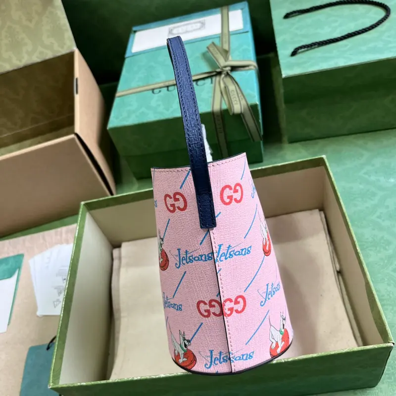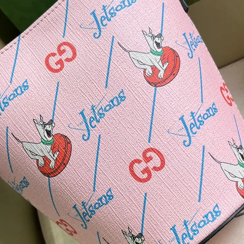 Children’s printed bucket bag (comes with full original green box packaging). Set in the year 2062, “The Jetsons” depicts a futuristic space age filled with magical props and whimsical gadgets, depicting a world of technological utopianism. Various garments and accessories feature prints or embroidered details, including animals and robots, playfully blending “The Jetsons” characters with the Gbag logo. Decorated with a GG “The Jetsons” print on pink Supreme canvas with blue Supreme canvas piping. “The Jetsons” and all related characters and elements are the property of & TM HB. (S23), nylon lining, handles with a 13cm drop. Model No. 752356. Dimensions: 18.5cm (W) x 16.5cm (H) x 7.5cm (D). Color: Pink/Jetsons pattern PVC.