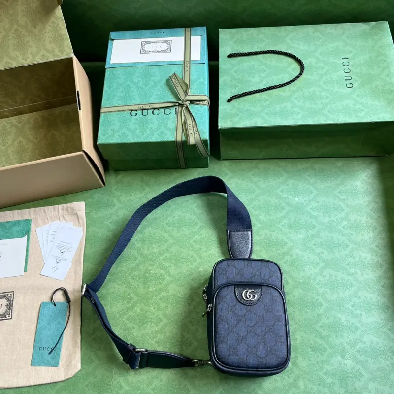[Includes full original green box packaging] Ophidia GG mini handbag. Small travel accessories remain an essential part of Gbag’s leather goods collection, paying homage to the brand’s roots in luxury travel. Various logos, inspired by the initials of the brand’s founder, Gbago Gbag, imbue the pieces with an elegant and timeless signature. This Ophidia mini handbag is crafted from classic GG Supreme canvas and features two card slots and an exterior zip pocket. It is crafted from blue and ebony GG Supreme canvas with blue leather trim, palladium-tone hardware, a blue web, and a cotton and linen lining with a Double G. The interior features two card slots, an exterior zip pocket, and a shoulder strap with a 52cm drop and zipper closure. Weight: Approximately 0.45 kg. Model No. 752565. Dimensions: 12cm (width) x 18cm (height) x 6.9cm (depth). Color: Blue/PVC.