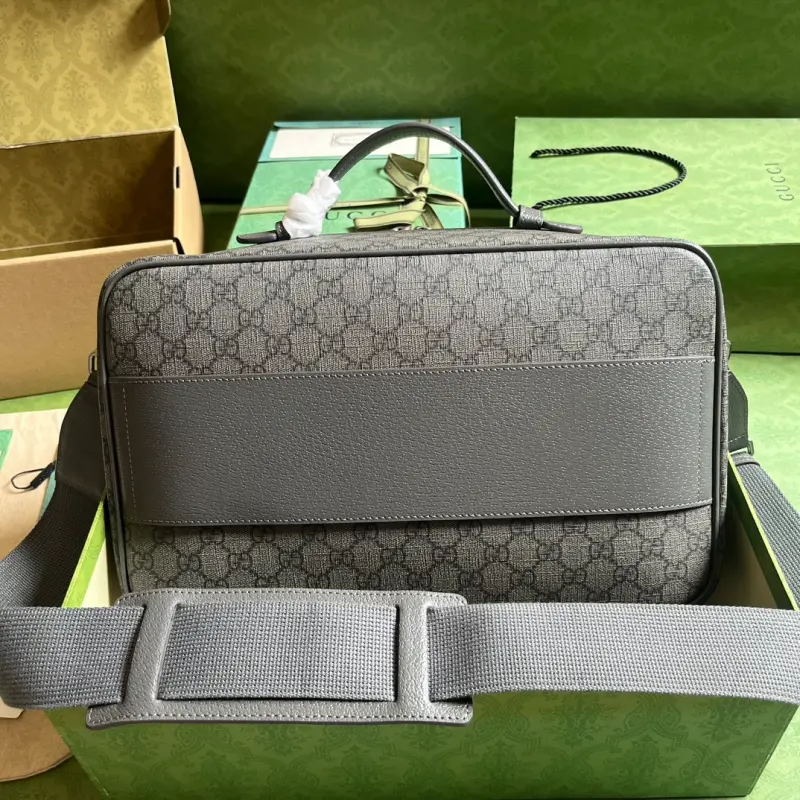 The Ophidia GG shoe bag (comes with a complete set of original green box packaging). The Ophidia collection blends Gbag’s heritage with modern design, presenting a striking new creation. Featuring the brand’s signature web and Double G hardware, the Ophidia bag is reimagined for a variety of silhouettes and sizes for the Pre-Fall 2023 collection. Crafted using the same craftsmanship as Gbag shoes, this bag shares the same exquisite craftsmanship as the latter, making it a masterpiece from the new collection. Made of beige and ebony GG Supreme canvas with gray leather trim, antique gold-tone hardware, and a nylon lining with Double G detailing, the bag features an interior with one zippered pocket, a top handle (5cm drop), a removable shoulder strap (52cm drop), and a zippered closure. Model No. 752587. Dimensions: 22cm (length) x 36cm (width) x 16cm (depth). Color: Gray/Gray PVC.