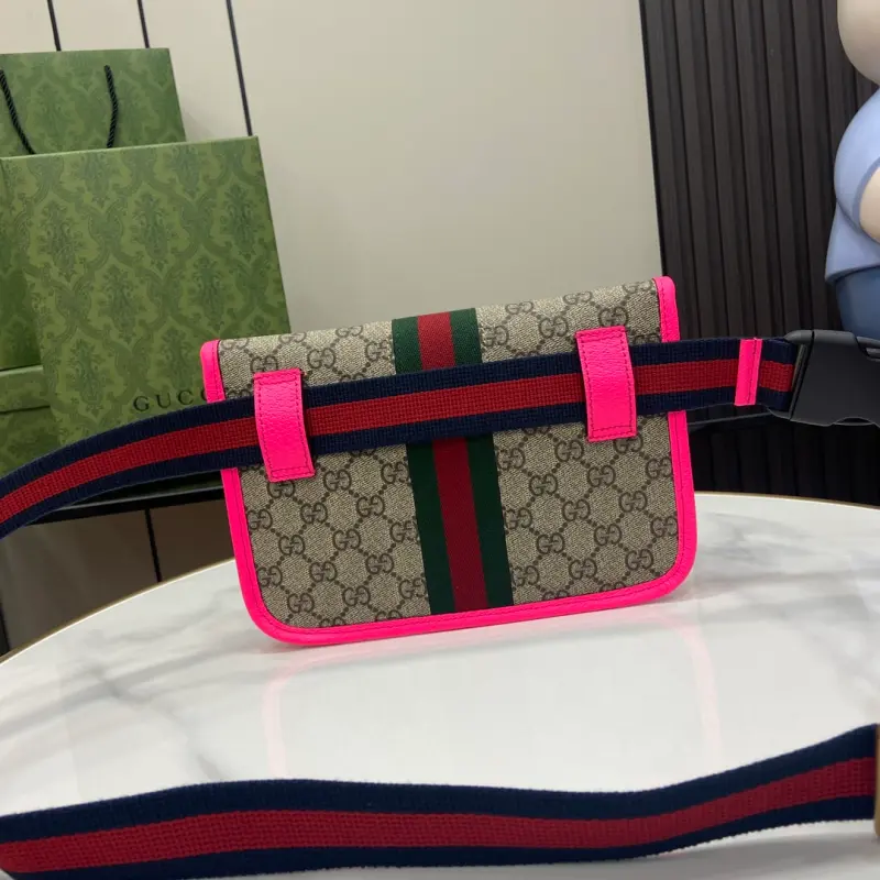 [Comes with a full set of original green box packaging] [New product] Ophidia series GG small waist bag. Fluorescent green embodies the contemporary aesthetic concept of the creative director, vividly interpreting the Ophidia series in a bright pop style. This small waist bag cleverly combines GG patterns and striped ribbon elements, and matches modern colors to show the urban style of classic travel items. Beige and ebony GG Supreme canvas, green leather piping, gold-tone hardware, red and green ribbon, red and blue ribbon belt, cotton and linen blend lining, double G, adjustable waist strap 52 cm high, 80.9 cm long, flap and magnetic snap closure. Model: 752597. Dimensions: 24 (width) x 17 (height) x 3.5 cm (depth) Color: fluorescent purple/pvc. Made in Italy