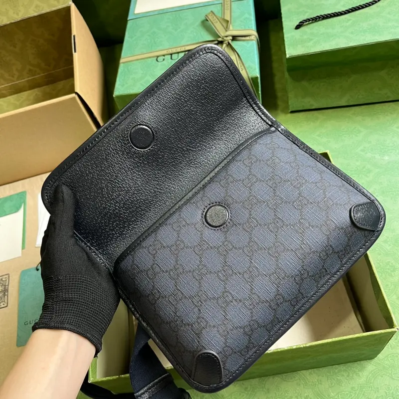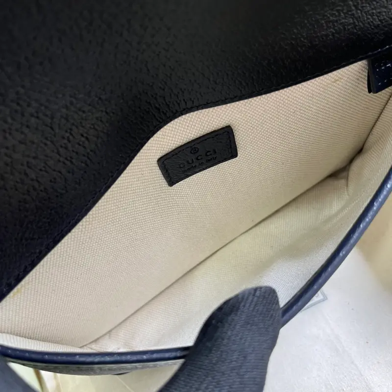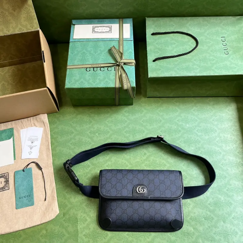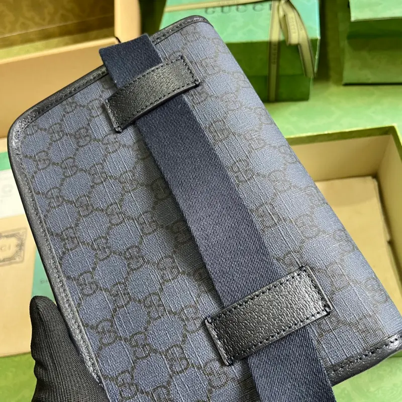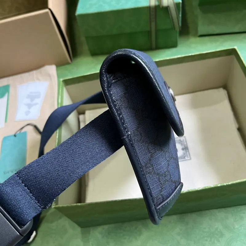 [Includes full original green box packaging] Ophidia GG small belt bag. For the Cruise 2024 collection, the Ophidia series features shoulder bags, totes, and handbags updated in black GG denim. Silver-toned hardware and metallic accents create a contrasting effect. This men’s belt bag cleverly combines Double G hardware with GG Supreme canvas, reimagining the classic material in blue and black. The adjustable waist strap allows for versatile carrying options. Made of blue and black GG Supreme canvas with black leather trim, palladium-tone hardware, and a cotton and linen lining with Double G, the belt adjusts from 52 to 81 cm in length and features a flap and magnetic snap fastening. Weight: Approximately 0.37 kg. Model No. 752597. Dimensions: 23.9 cm (width) x 17 cm (height) x 3.6 cm (depth). Color: Blue/PVC.