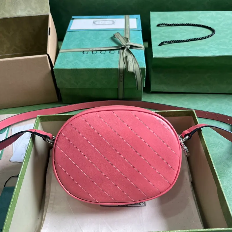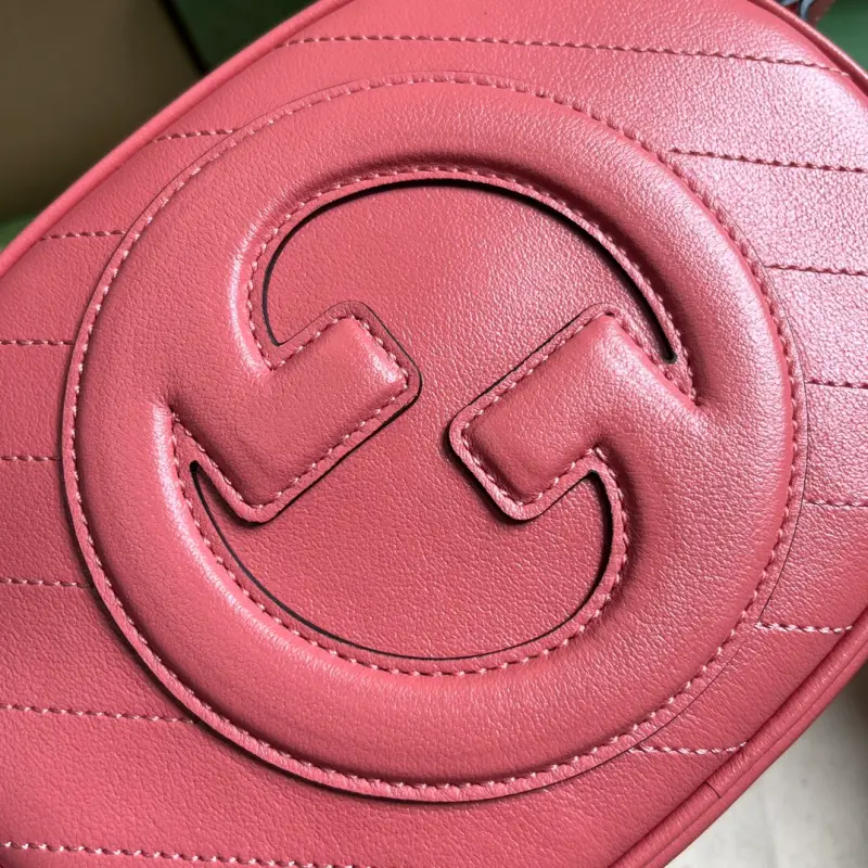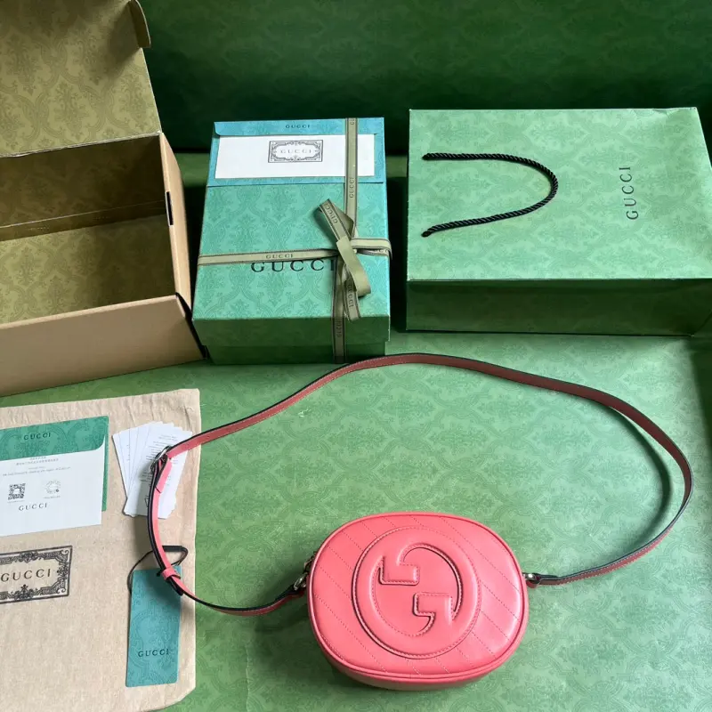 [Includes full original green box packaging] Gbag Blondie mini shoulder bag. While featuring one of the brand’s boldest and most modern patterns, the Gbag Blondie collection maintains a subtle, understated aesthetic with its tonal leather designs. The collection ingeniously incorporates the circular, geometric Interlocking GG motif, embodying Gbag’s vibrant energy. This pink leather mini shoulder bag is a prime example. Made of pink leather with a cotton lining and a circular Interlocking GG leather patch, it features one open pocket, a shoulder strap (56 cm drop), and a zipper closure. Weight: approximately 0.4 kg. Model No. 760175. Mini dimensions: 15 cm (length) x 20 cm (width) x 8 cm (depth). Color: Pink/Original Leather.