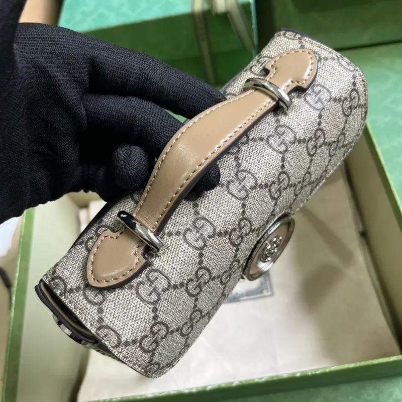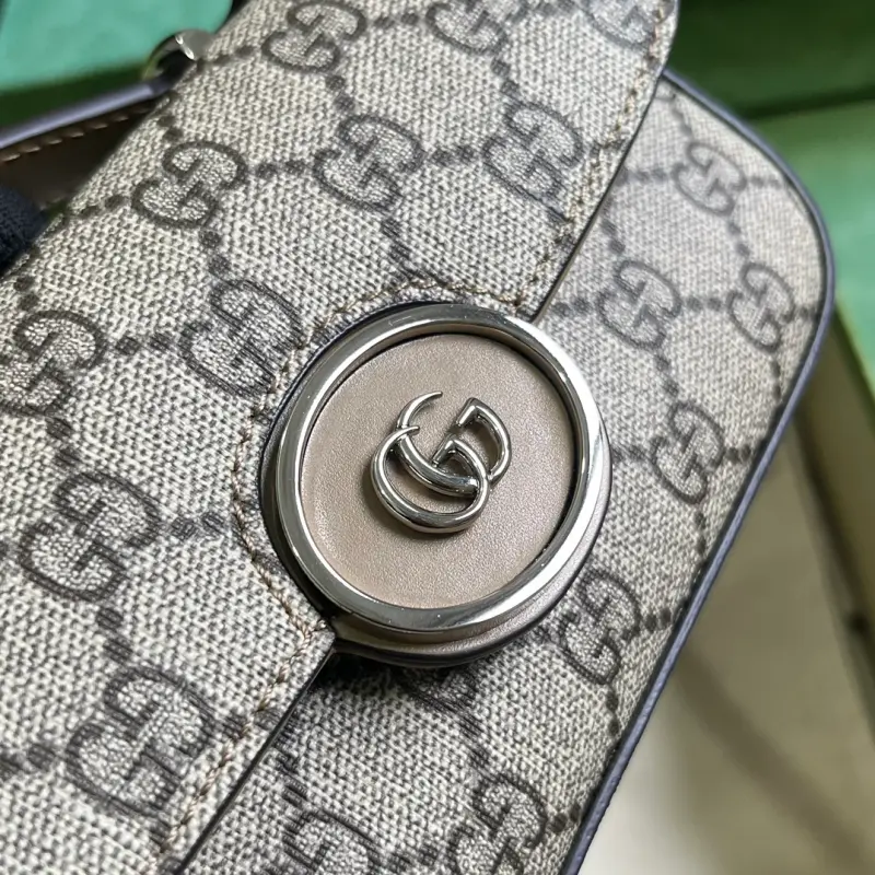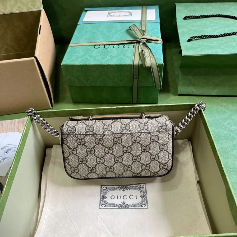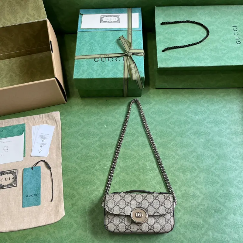 The Petite GG mini handbag, complete with original green box packaging, features the iconic Double G in miniature form across various new leather goods in the mini GG collection, imbuing the iconic logo with a subtle, understated elegance. The elegant palladium-effect logo blends seamlessly with solid leather and GG Supreme canvas. The brand’s signature adds a touch of class to this beige and ebony GG Supreme canvas mini bag. It features beige and ebony GG Supreme canvas with palladium-tone hardware, a Double G lining in a suede-like microfiber texture, an interior pocket, a back pocket, a handle (3 cm drop), and a detachable chain shoulder strap (30 cm drop) with a push-lock closure. Weight: Approximately 0.41 kg. Model No. 760194. Dimensions: 10 cm (length) x 18.5 cm (width) x 4 cm (depth). Color: Brown/PVC.