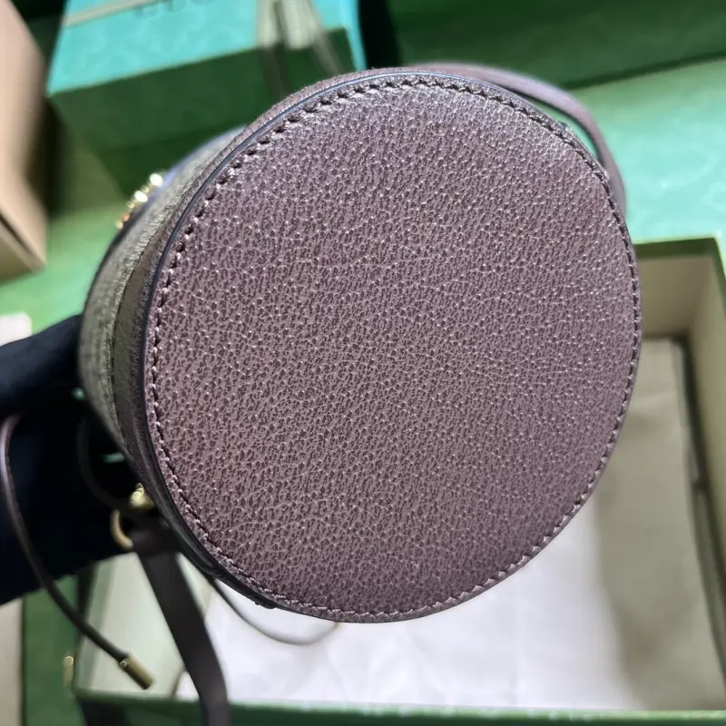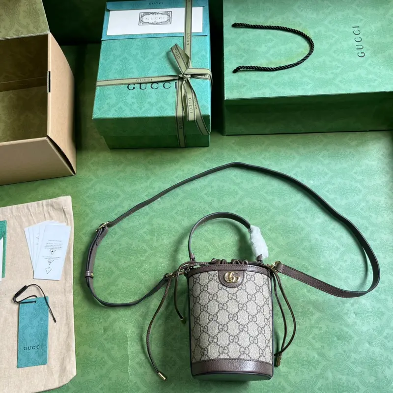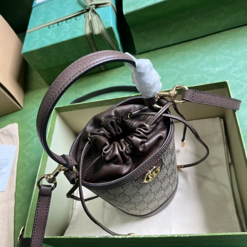 [Includes full original green box packaging] Ophidia mini bucket bag. The Ophidia series is reimagined with new sizes and styles, featuring a combined handle and shoulder strap for versatile carrying options. The iconic Double G hardware adds a touch of class to this mini bucket bag. Made of beige and ebony GG Supreme canvas with brown leather trim and gold-tone Double G hardware, it features a top handle (12cm drop) and an adjustable shoulder strap (50cm drop) with a drawstring closure. Weight: approximately 0.3 kg. Model No. 760199. Dimensions: 11.5cm (width) x 20cm (height) x 8cm (depth). Color: Brown/PVC.