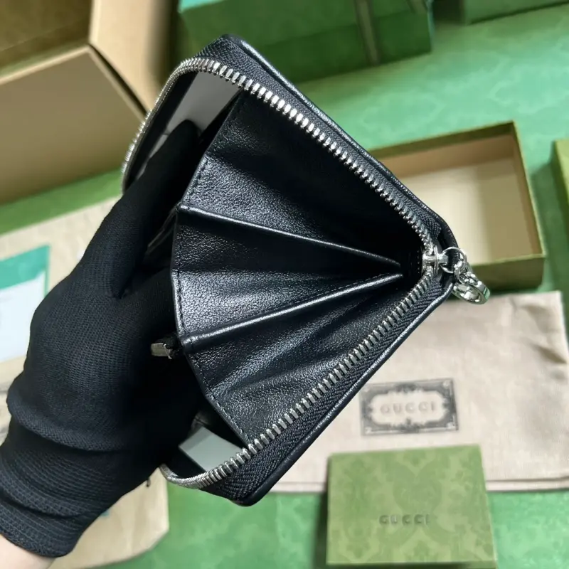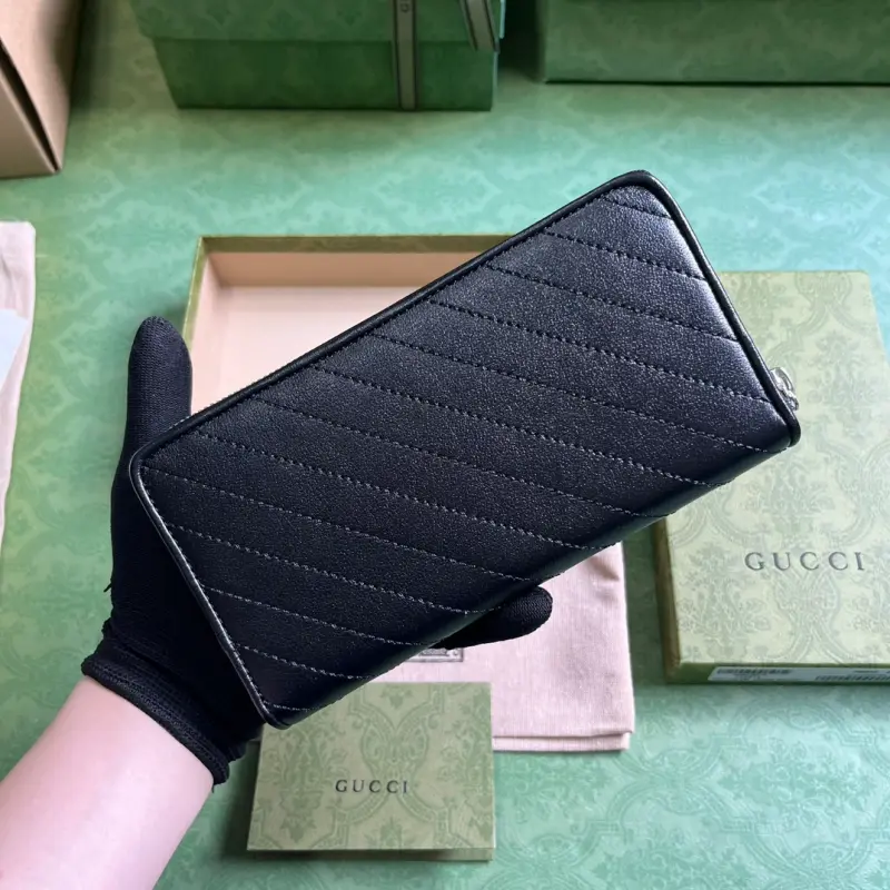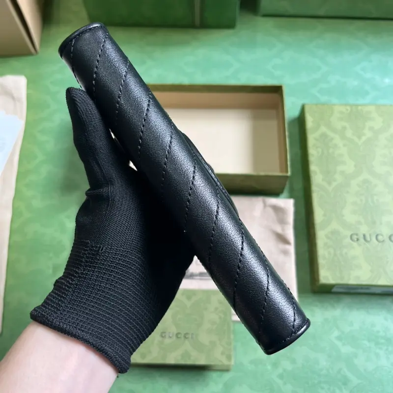 [Includes full original green box packaging] Gbag Blondie zip-around wallet. The Gbag Blondie collection features one of the brand’s boldest patterns paired with tonal leather, exuding a subtle and understated vibe. The collection ingeniously incorporates the circular, geometric Interlocking GG logo, showcasing Gbag’s modern aesthetic. This black leather zip-around wallet features a prominent Interlocking GG detail. The interior features black leather, a taffeta lining, and a circular Interlocking GG leather patch. The interior includes twelve card slots, three bill compartments, and a zippered coin pocket with zipper closure. Weight: Approximately 0.18 kg. Model No. 760312. Dimensions: 11 cm (length) x 19.5 cm (width) x 3 cm (depth). Color: Black/Original Leather.