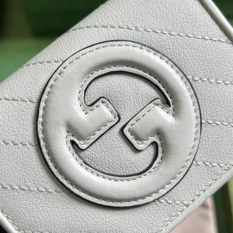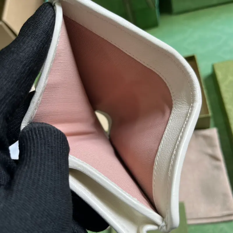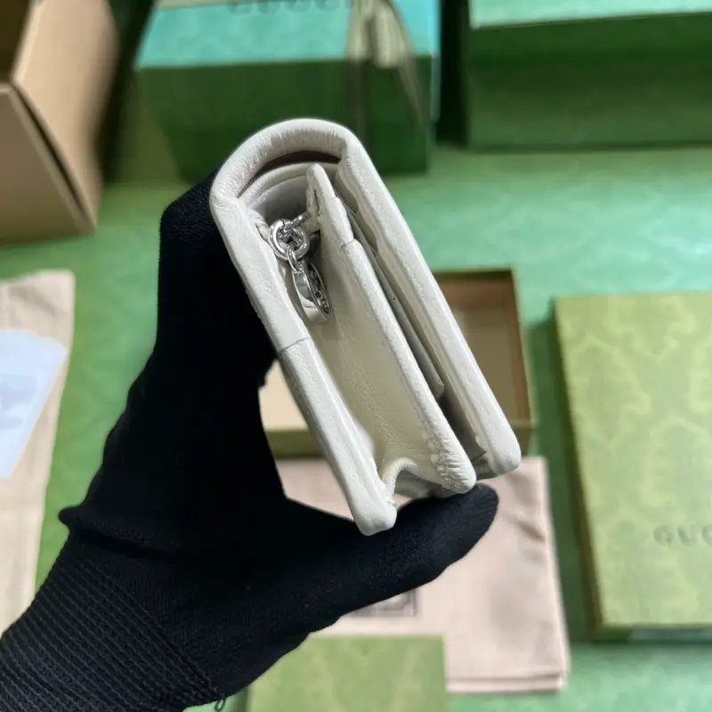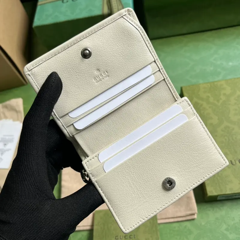 [Includes full original green box packaging] Gbag Blondie card holder. The Gbag Blondie collection features one of the brand’s boldest patterns paired with tonal leather, exuding a subtle and understated vibe. The collection ingeniously incorporates the circular, geometric Interlocking GG logo, showcasing Gbag’s modern aesthetic. This white leather card holder features a striking Interlocking GG detail. The interior features white leather, a taffeta lining, and a circular Interlocking GG leather patch. The interior includes five card slots, an open pocket, and a zippered pocket with a snap closure. Weight: Approximately 0.2 kg. Model No. 760317. Dimensions: 8.5 cm (length) x 11 cm (width) x 3 cm (depth). Color: White/Original Leather.