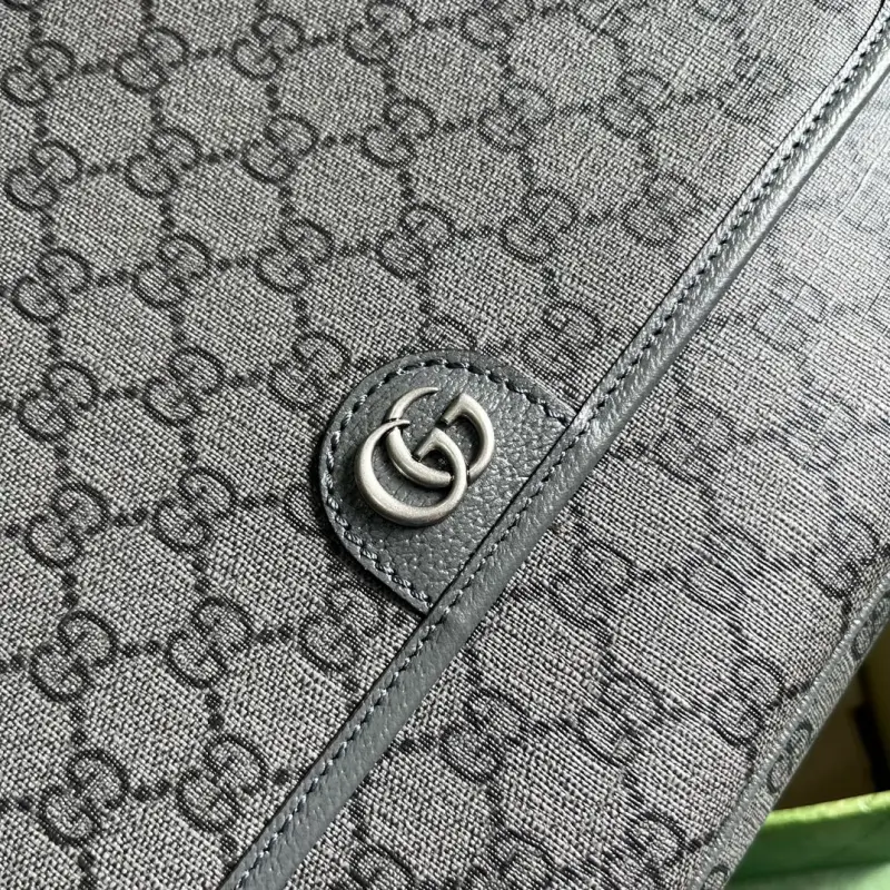 [Includes full original green box packaging] This medium Ophidia messenger bag in GG Supreme Tender canvas is a charming interpretation of the men’s accessories collection. The soft and durable material brings a contemporary touch to the brand’s classic design. This Ophidia messenger bag is crafted from gray and black GG Supreme Tender canvas and embellished with Double G hardware. It features gray and black GG Supreme Tender canvas with gray leather trim and a cotton and linen blend lining with Double G. It has one interior zipper pocket and one exterior zipper and two magnetic pockets. It also has an adjustable shoulder strap (47 cm drop) with a magnetic flap closure. Weight: approximately 1.1 kg. Model No. 761741. Dimensions: 28 cm (width) x 22 cm (height) x 8 cm (depth). Color: Gray/PVC.