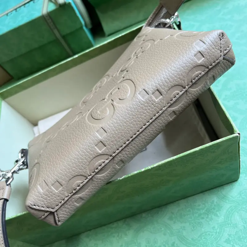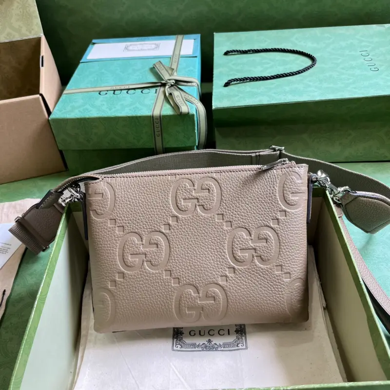[Includes full original green box packaging] Small Super Double G messenger bag. Gbag transforms heritage, creativity, and innovation into a vibrant collection. From staple pieces to statement accessories, from everyday wear to special occasion pieces, the brand’s beloved patterns add color to its new leather goods. This messenger bag, expertly crafted from gray Super Double G leather, represents a fresh take on the luggage collection. Gray Super Double G leather with a cotton and linen lining. Interior: one zippered pocket with zip closure. Model No. 761747. Dimensions: 23cm (width) x 16.5cm (height) x 4.5cm (depth). Color: Gray/Original G Embossed Leather.