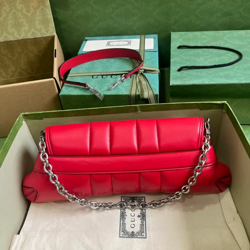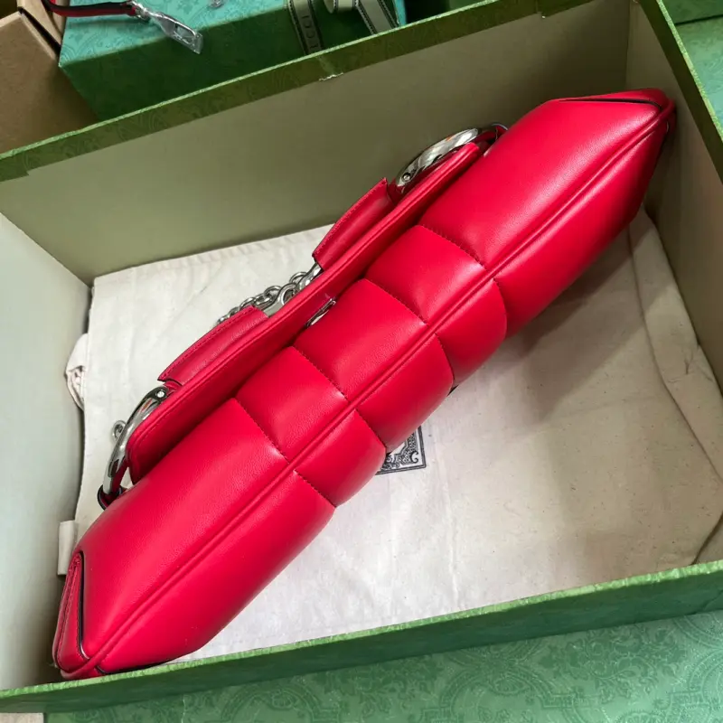 The Gbag Horsebit Chain Medium Shoulder Bag (Includes Full Original Green Box) showcases a reimagined Gbag icon, skillfully blending archival design with contemporary innovation to embody a contemporary aesthetic. This bag, ingeniously embellished with the horsebit design, a signature element of the brand from the early 2000s, celebrates the brand’s heritage. Reimagined for the Fall/Winter 2023 collection, it features a contemporary aesthetic in a variety of colors and textures. Made of red quilted leather with palladium hardware, this item is NFC-enabled for authenticity verification and a digital innovation. The bag features a horsebit closure, a card compartment and pocket, a detachable leather strap (21 cm drop), a detachable chain shoulder strap (20.5 cm drop), and a magnetic snap closure. Weight: Approximately 0.7 kg. Model No. 764255. Dimensions: 38 cm (width) x 15 cm (height) x 16 cm (depth). Color: Red/Original Leather.