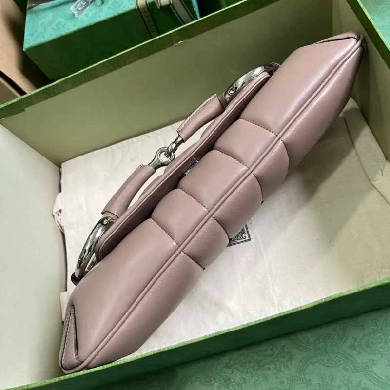 The Gbag Horsebit Chain Medium Shoulder Bag (Includes Full Original Green Box) showcases a reimagined Gbag icon, skillfully blending archival design with contemporary innovation to embody a contemporary aesthetic. This bag, ingeniously embellished with the horsebit design, a signature element of the brand from the early 2000s, celebrates the brand’s heritage. For the Fall/Winter 2023 collection, this bag features a contemporary twist in a variety of colors and textures. It features milk tea quilted leather with palladium hardware. As a select item with the Gbag Tag, this item is NFC-enabled for authenticity verification and a digital innovation. The bag features a horsebit closure, a card compartment and pocket, a detachable leather strap (21 cm drop), a detachable chain shoulder strap (20.5 cm drop), and a magnetic snap closure. Weight: Approximately 0.7 kg. Model No. 764255. Dimensions: 38 cm (width) x 15 cm (height) x 16 cm (depth). Color: Milk tea/original leather.